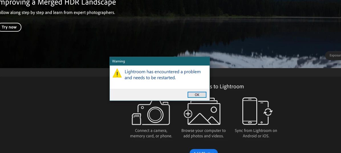Lightroom has encountered a problem and needs to be restarted