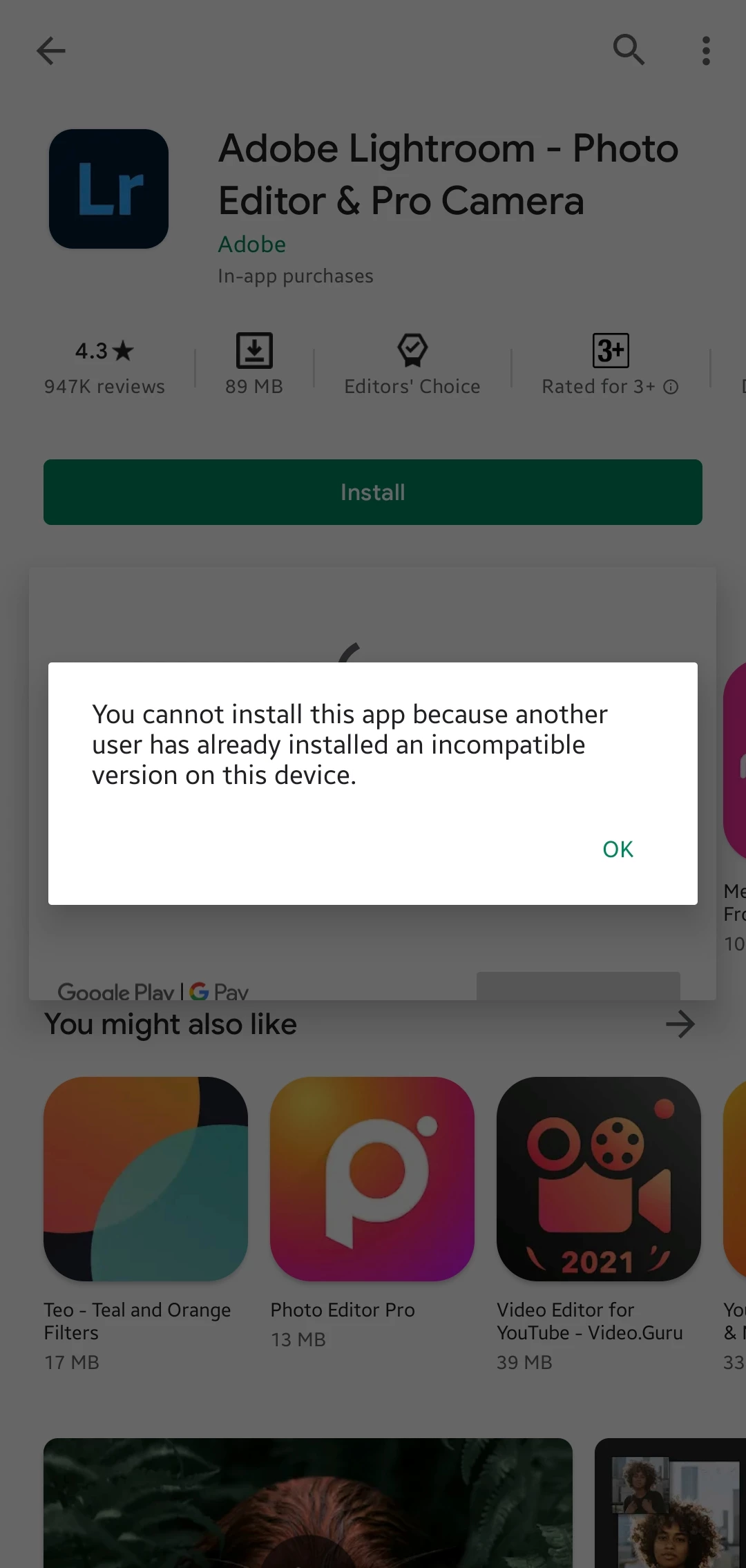NNarayan5C08ParticipantForum|Forum|5 years agoMarch 14, 2021QuestionLightroom installation issueForum|Forum|5 years agoMarch 14, 20210 replies140 viewsI try to install Adobe lightroom but it is showing, you can't install this app because another user has already installed an incompatible version on this device. So how to download it please tell solution.MobileProblem or error