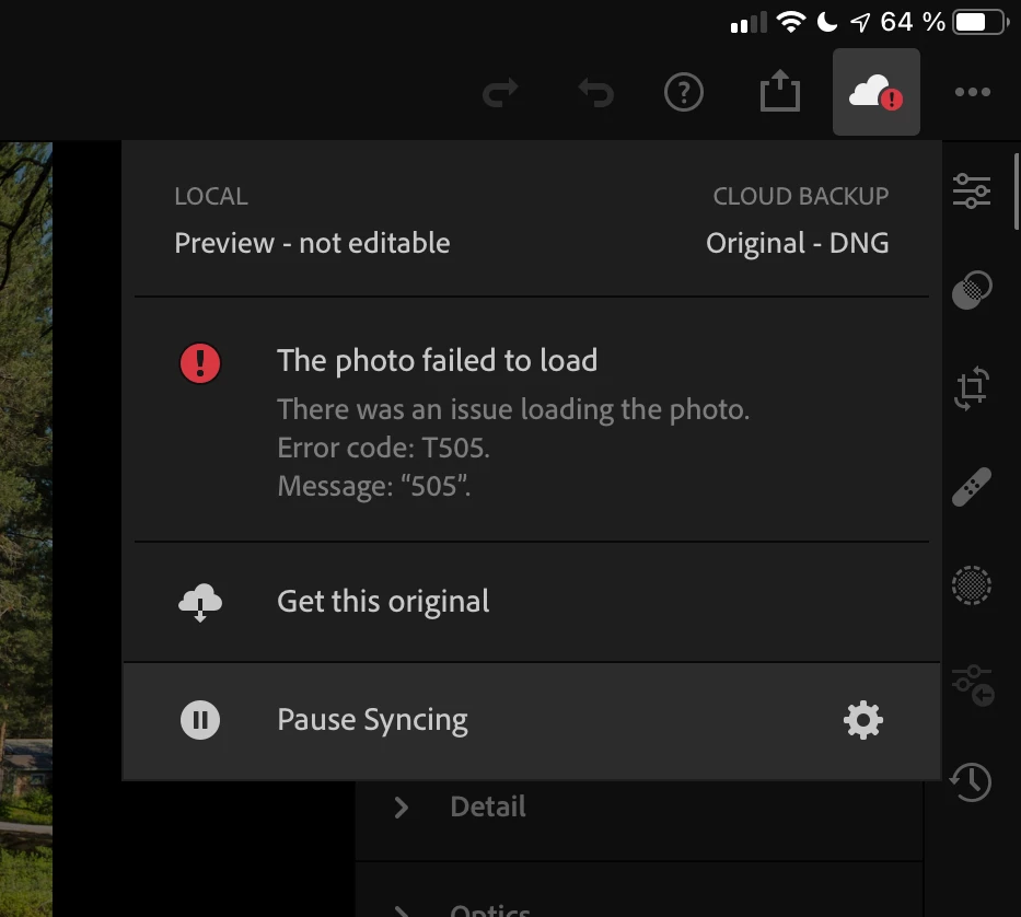 Lightroom iPad, error T505 opening cloud photos