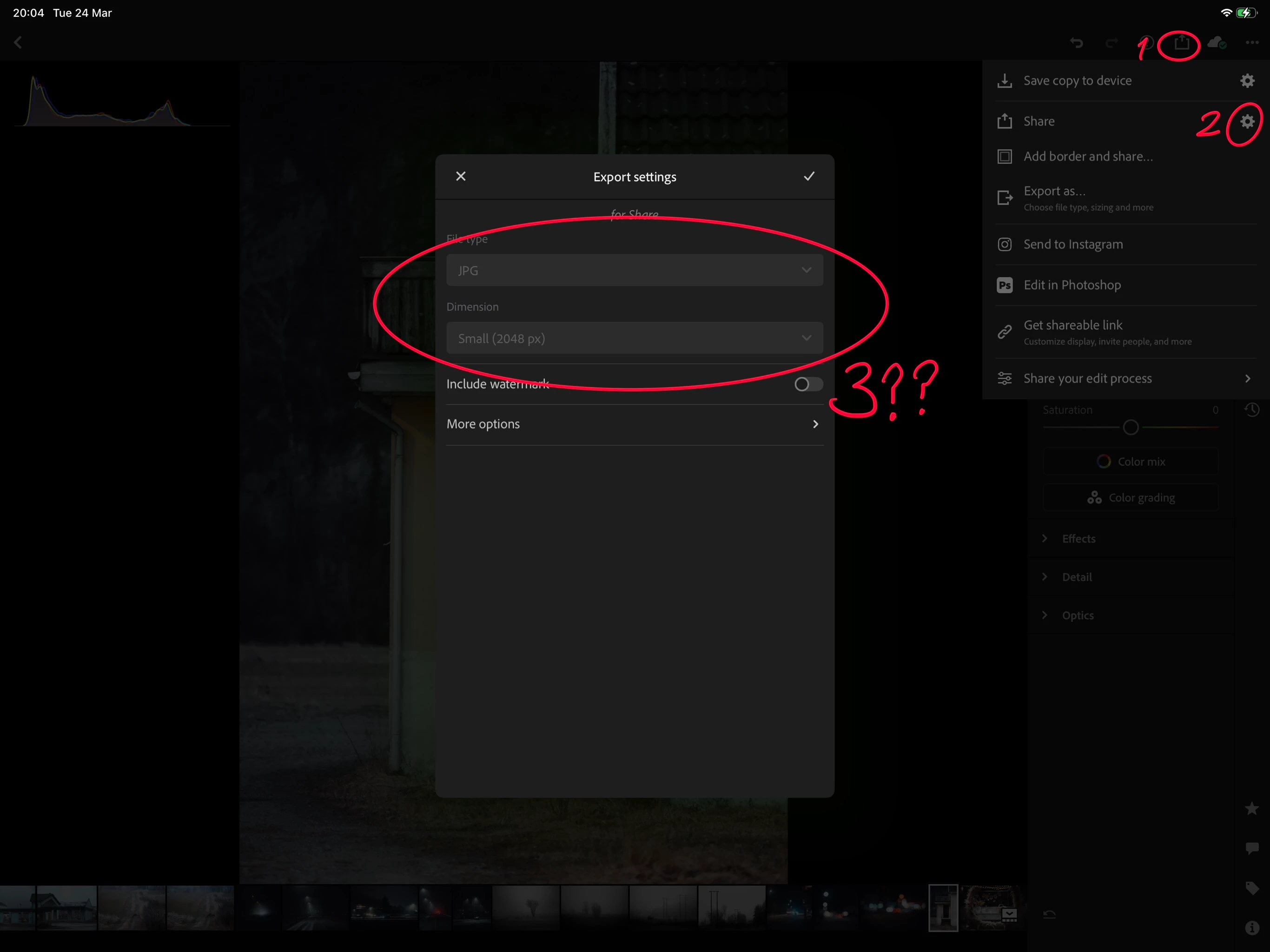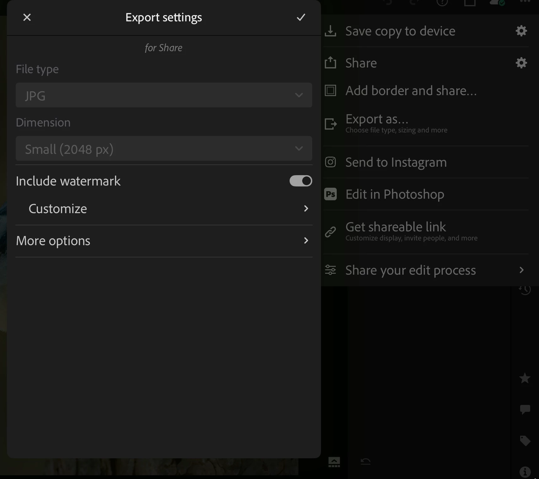 When I select the “Share” icon in the upper right of the UI, Export settings for Share opens. The top two options, “File type” and “Dimension” are greyed out, though I can still “Include watermark” and go to “More options”.