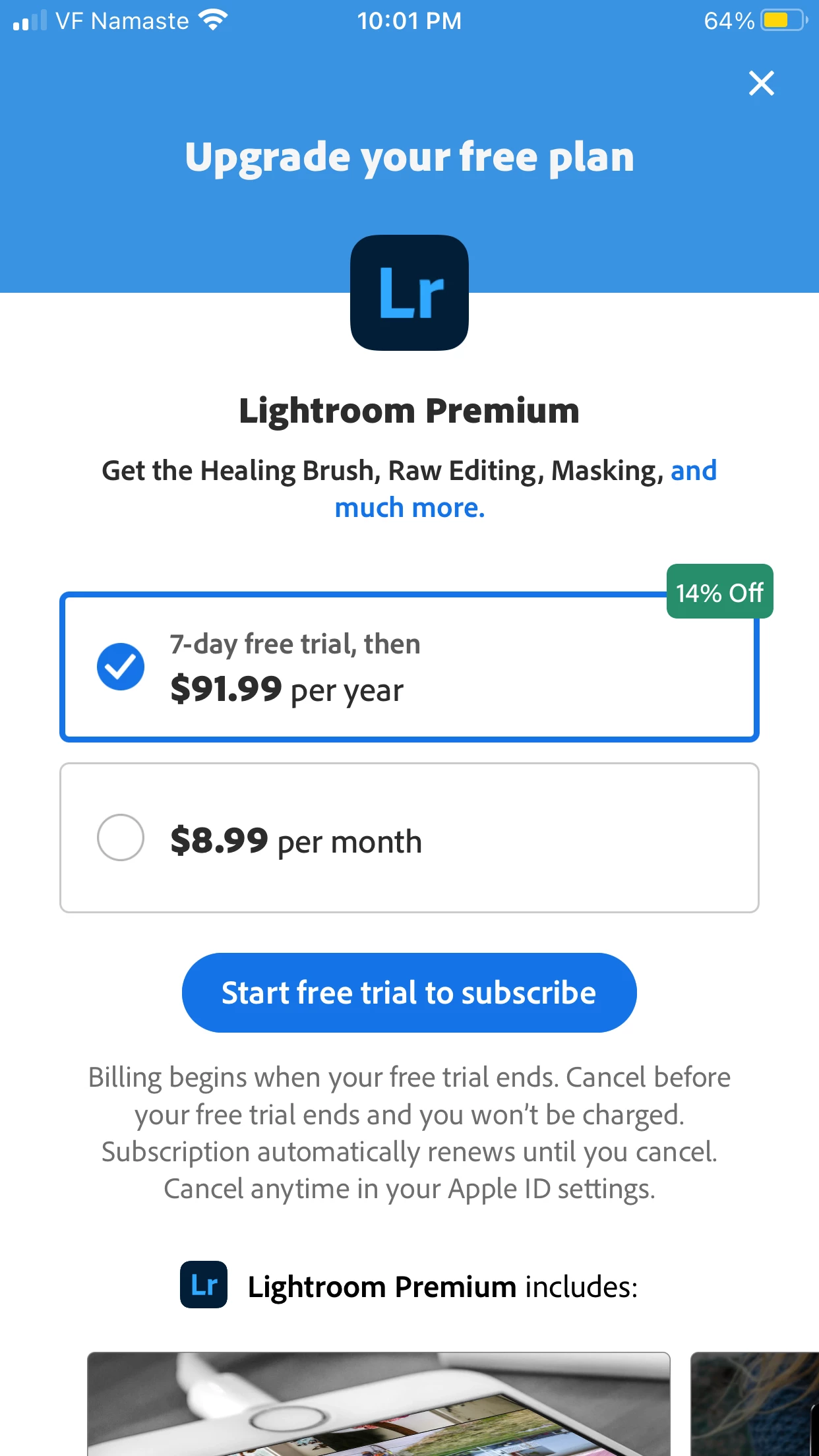 Hi, i installed lightroom many times but its always showing the same thing to upgrade premium from free version. I cannot able to do anything with this app. I also uploaded screenshot of lightroom app.