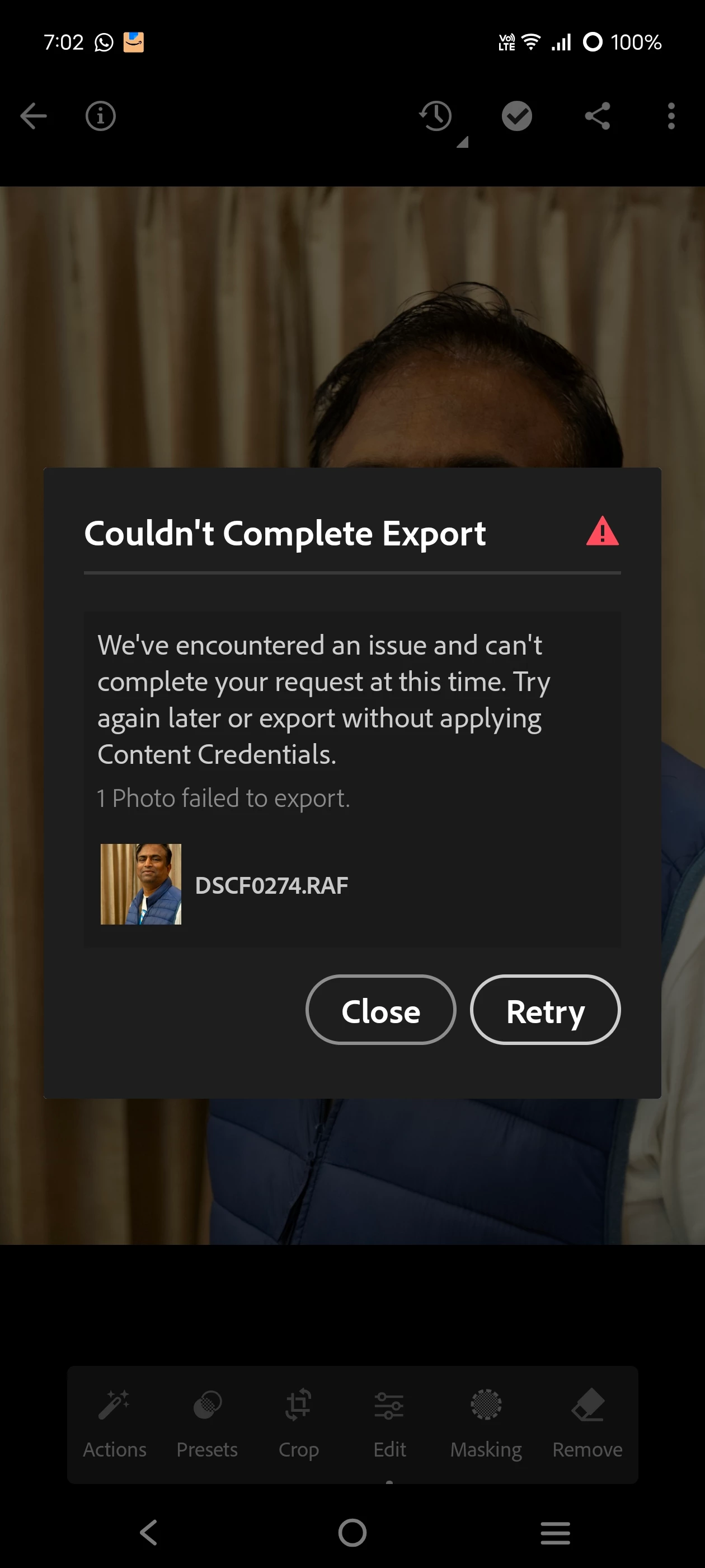 I've been using LR mobile on my phone flawlessly for months, even exporting hundreds of photos at once for a certain job. Yesterday during a wedding I was editing and exporting single photos normally with no issues. Suddenly "1 photo failed to export". Retry option gives an instant same error. This is happening on my phone, Xiaomi Note 9 Pro, wich hasn't exported a single photo since then. Tested on a tablet minutes ago and apparently no issues. On my phone I've already tried the following: