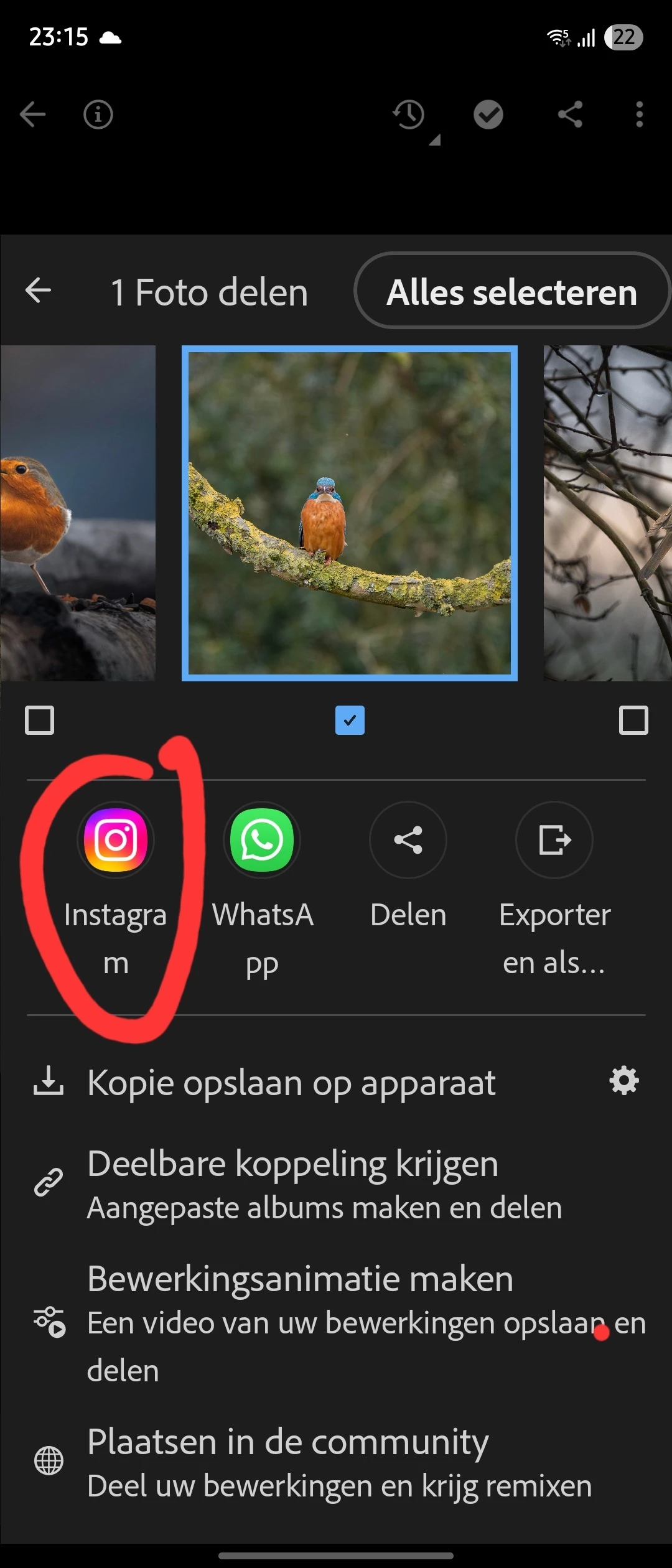 In lighroom mobile there is a instahram button to share the photo directy to instagram. See attachment.