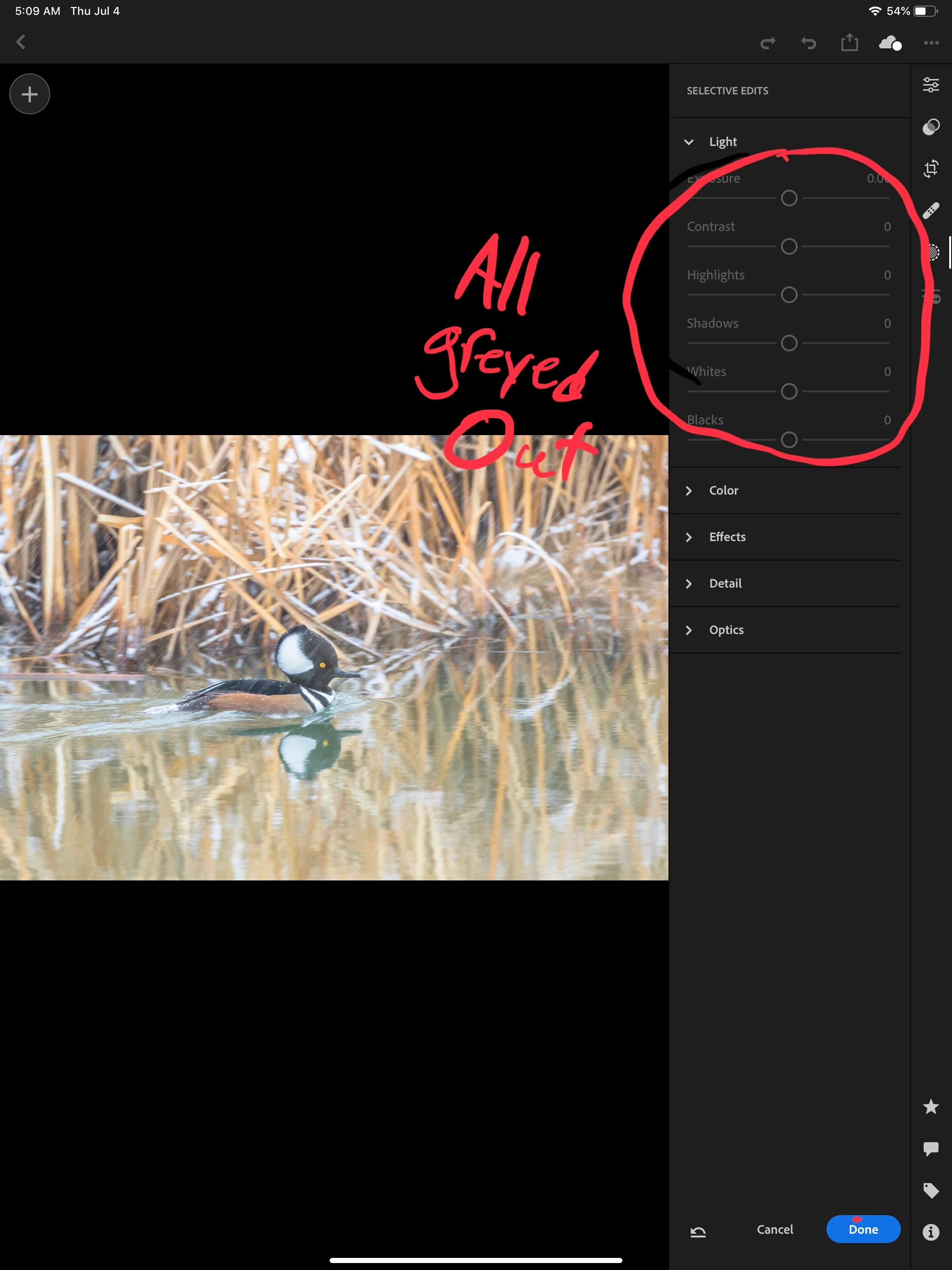 Hi JC. Did I get it right that when you open up a photo in Selective Edits mode and when you then tap the top left "+" icon which gives you the offer to choose between Brush, Radial or Linear Gradient ....and once processed one of them that the editing controls are diabled or when you open up a photo with exiting brushes, could you try to select one of the small indicators. Let me know if that helps.