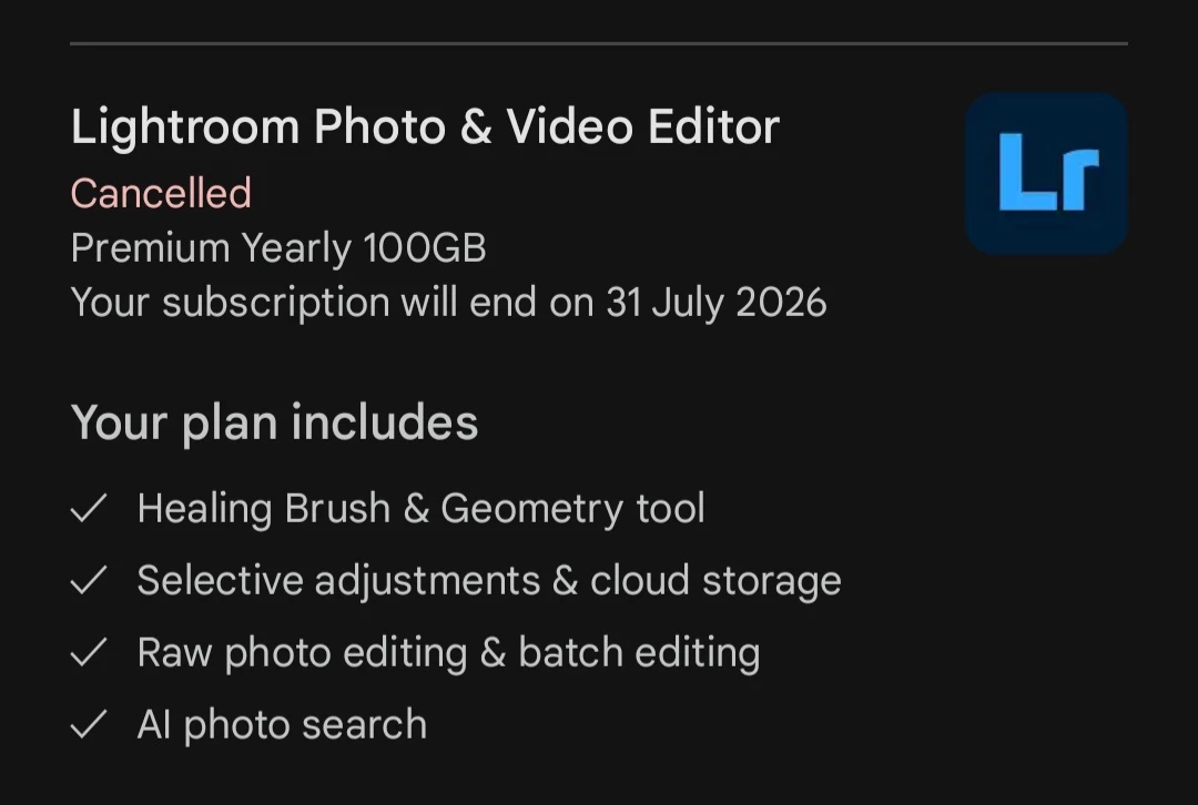 I paid for a yearly subscription for Lightroom on my phone on Google Play. My Google Play subscriptions page says it's still active and due to end on July 31st 2026. However, Lightroom says it's expired and even in my Adobe account, it's apparently expired. Restore purchase isn't working, so I'm not sure what to do or how to fix this.