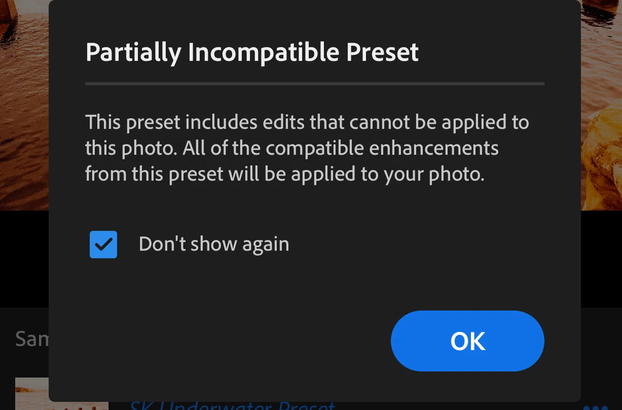 Hi, I have Lightroom mobile, the free version, and am trying to use presets I just purchased. When I click on a preset to use it, it says: “This preset includes edit that cannot be applied to this photo. All of the compatible enhancements from this preset will be applied to your photo.” (see attached photo) Is that because I don’t have the paid version or what’s the reason for that? Thanks