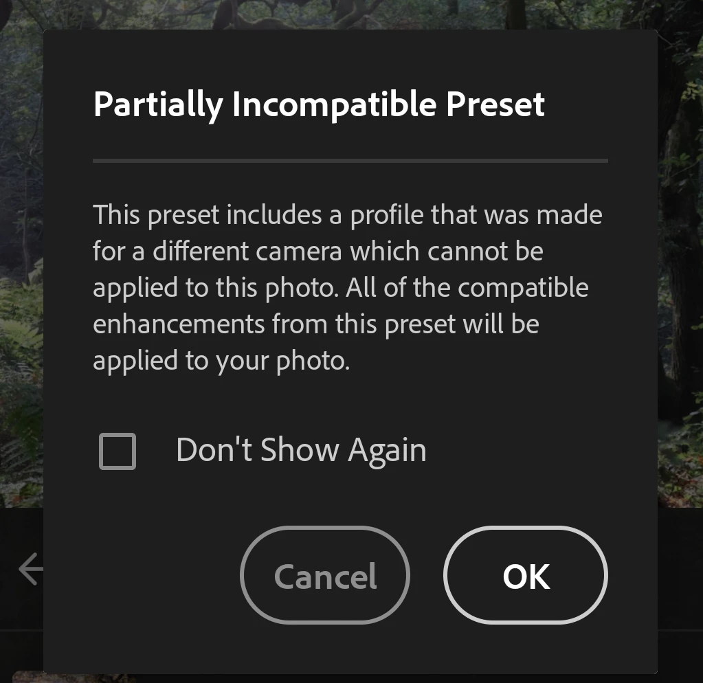 - When attempting to use a preset for the first time on a picture that wasn't taken on either Canon or Lumix, I get the following error message appear: "This preset includes a profile that was made for a different camera which cannot be applied to this photo. All of the compatible enhancements from this preset will be applied to your photo"