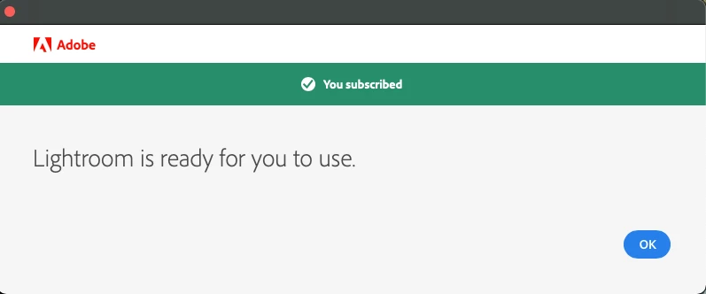 When I then say "buy lightroom" it sends me to a window telling me purchase is done. But then I still can't enter lightroom because it keeps saying I am in trailmode which expired.