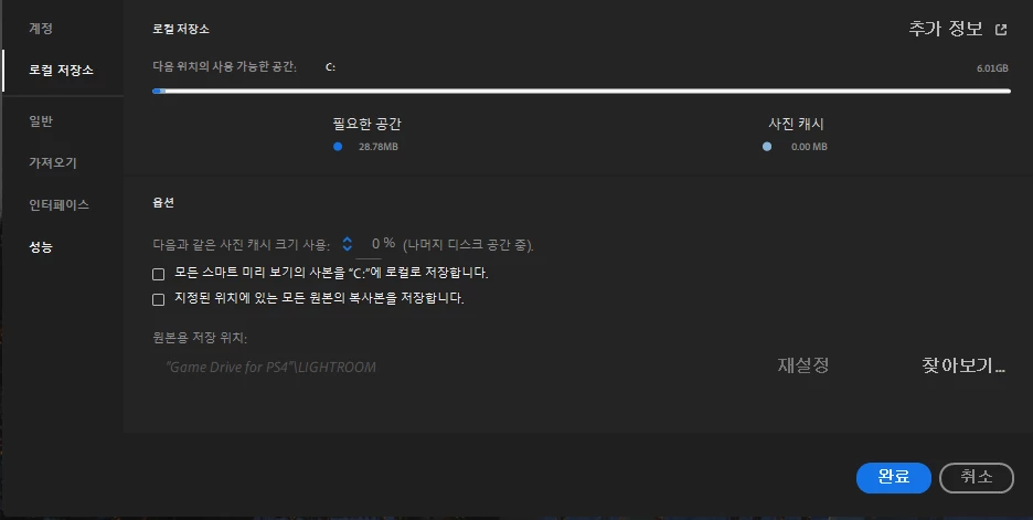 As soon as I start Lightroom, about 2GB of storage disappears. Closing lightroom will also lose about 100mb of storage. This picture is my lightroom default setup (drive is set to D drive).