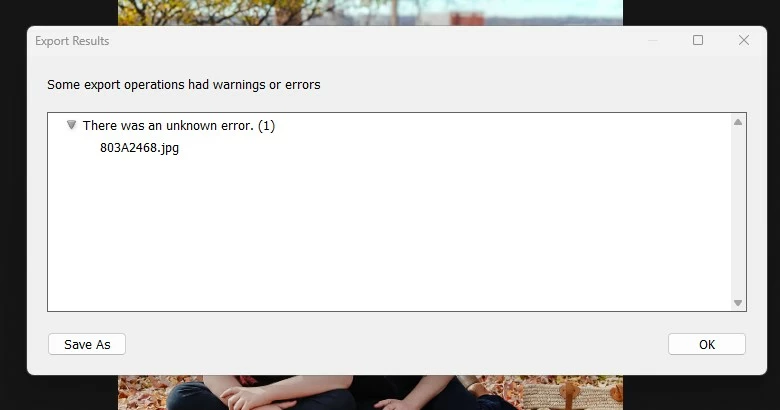Hello there! I literally used lightroom a couple of days ago and had NO issues. Today I go in, edit a photo and go to save it (I click the Share button, make sure the settings are where I want them via Custom, click Export 1 Photo) and it thinks about it for a few moments and then gives me this error that I will include a screenshot of in the post. I've restarted my computer. I've restarted lightroom and also restarted it again while holding down alt and ctrl to reset the lightroom settings. Still won't work. Is lightroom just on the fritz right now? I've used it for years and have never experienced this. Please help, I would seriously appreciate it haha. I'm losing my mind over here and have photos for a client to do