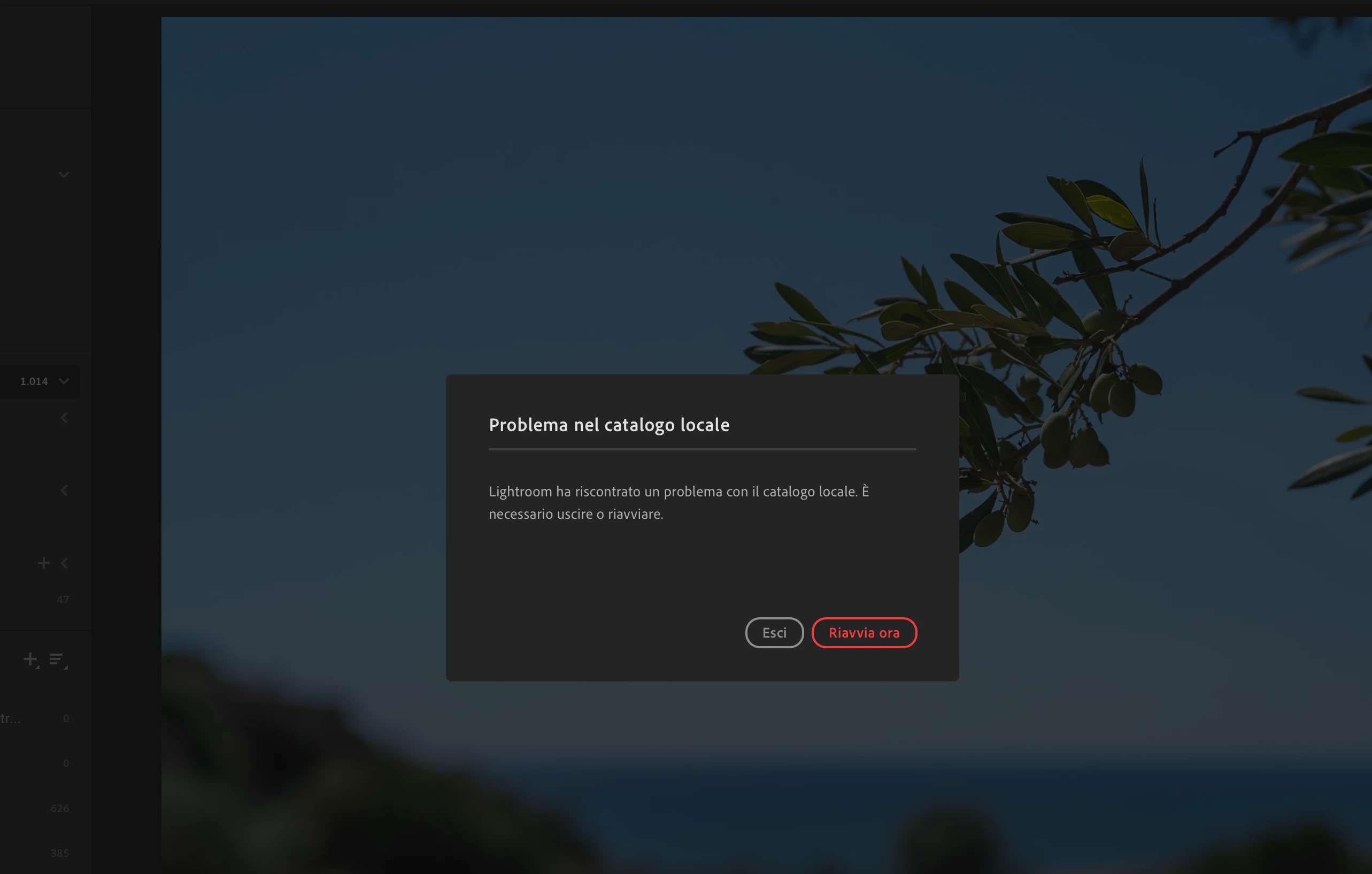 Lightroom says has “found an issue with the local catalogue” and requests to exit or reboot but this does not seem to solve the issue!