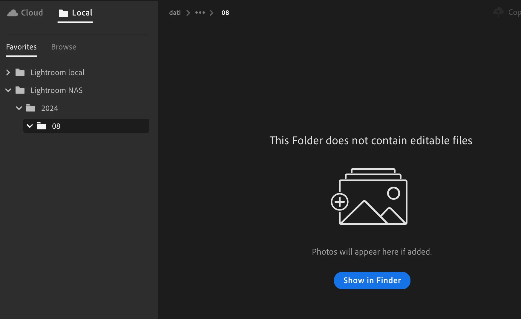 If I move images to local using "archive locally" function, ad I use a network folder from my nas mounted via NFS, the copy of files and the removal from cloud works, but if I look at the local folder in Lr, it's empty.