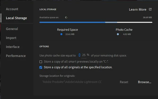 Then I changed the Local Storage Settings in Lightroom aswell, deleted the old folder from Lightroom on the old SSD and restarted Lightroom but it still shows me that ther is not enough available space on C: (My old SSD)
