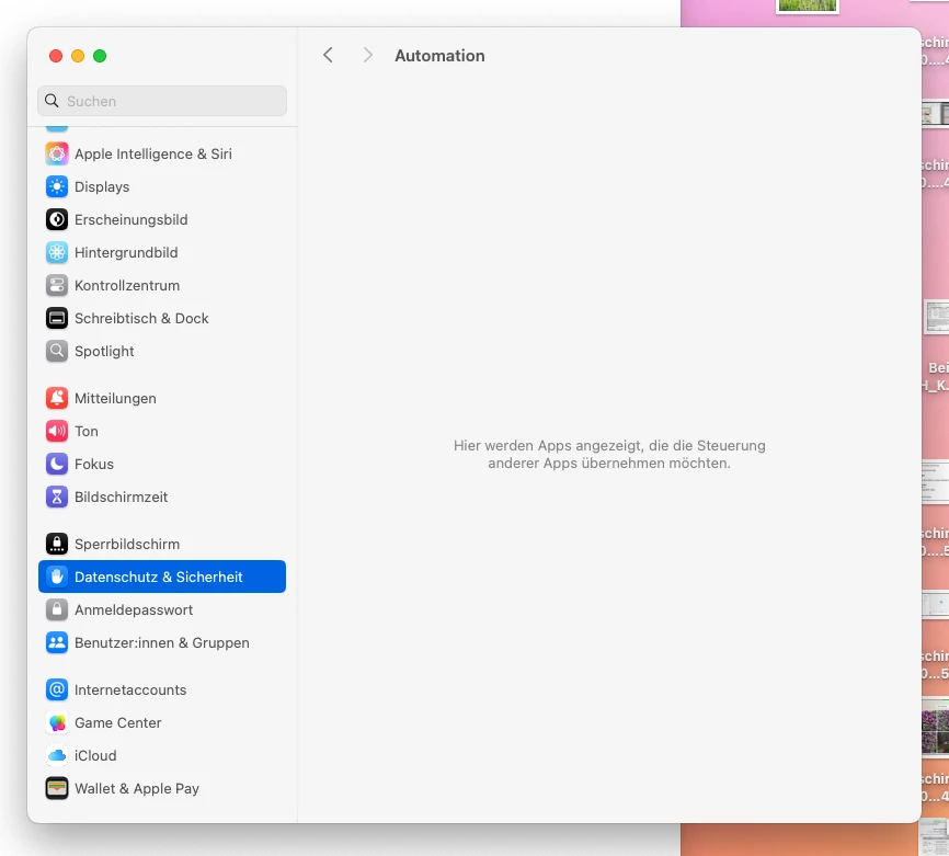 The error message tells me to check the Mac OS system settings (I am translating from German, it's supposedly in the security/automatization section of MacOS.). However, in that section of the Mac's system settings, there' only an empty window.