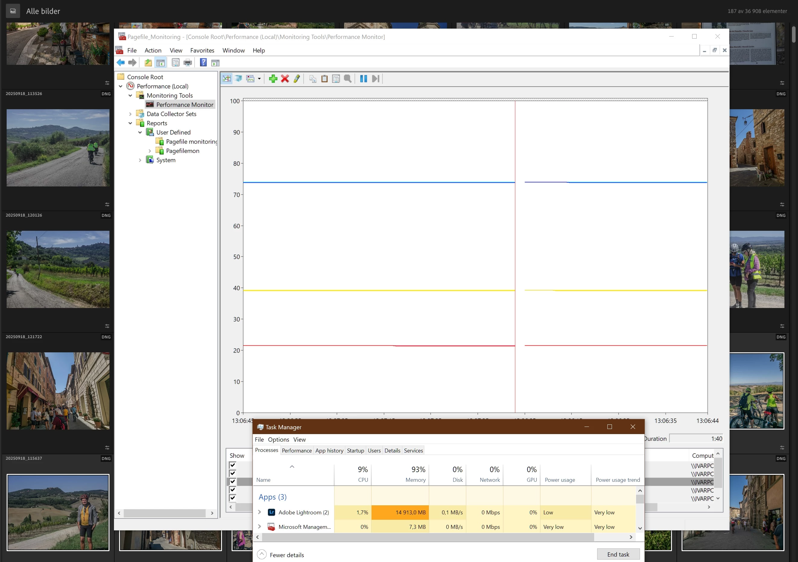 LR freeze at ~170 pictures processing. 32 GB memory, ~15GB pagefile. DNGs imported from Samsung Galaxy S23 Ultra at 12 MB size. Graphic card NVIDIA 5070 Ti. Task Manager memory peaks at ~95% before freeze.