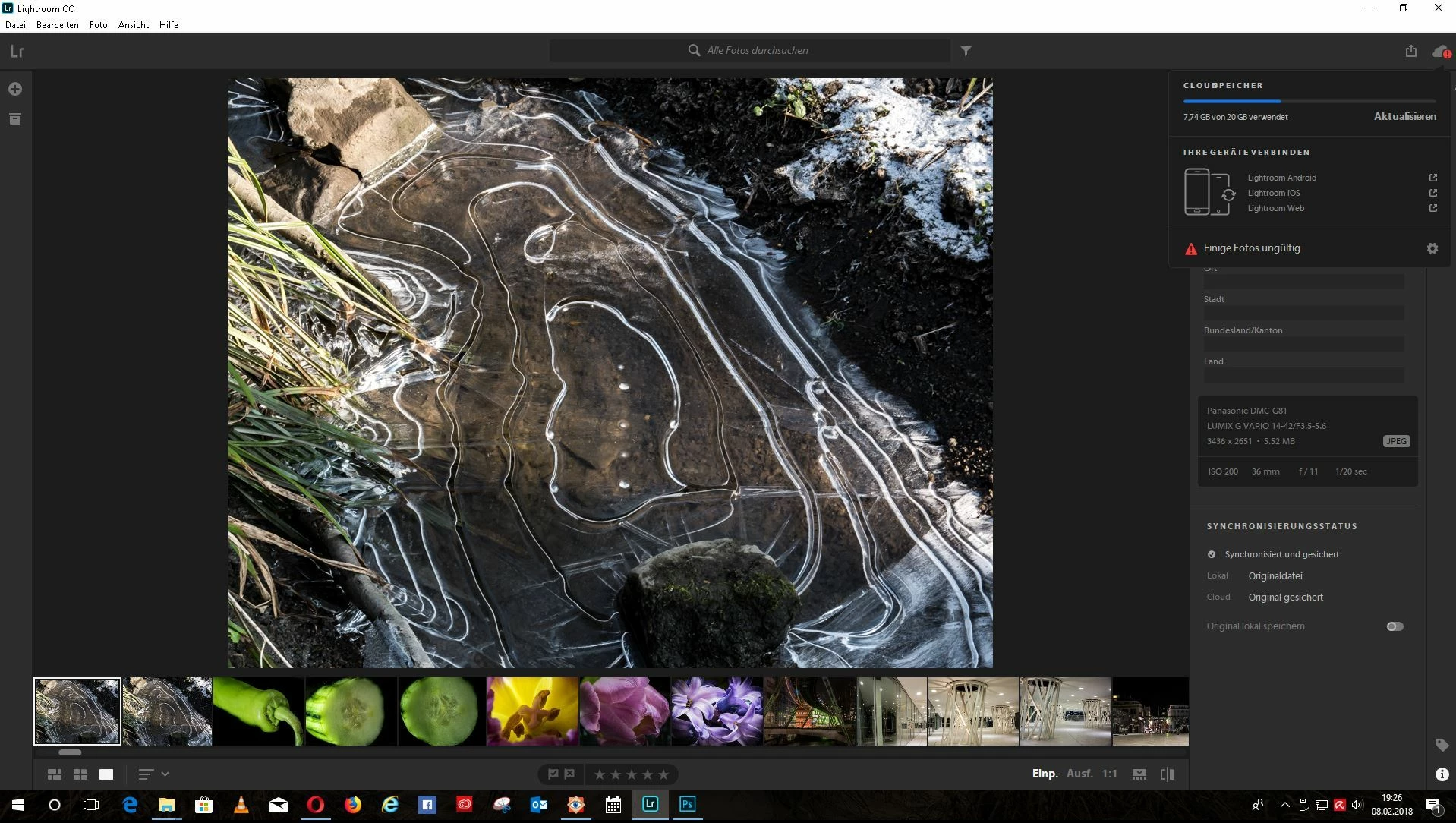 An der Wolke ist ein rotes Ausrufezeichen. Klick man drauf erscheint der Hinweis "einige Fotos ungültig"