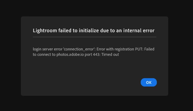 having issues with logging onto Lightroom for my desktop. I have redownloaded on 2 computers to no avail. When it open on one it says, "Lightroom could not connect to the server" When I open on the other it says, "Lightroom failed to initialize due to an internal error, login server error "connection_error': Error with registration PUT: Failed to connect to photos.adove.io port 443: timed out.