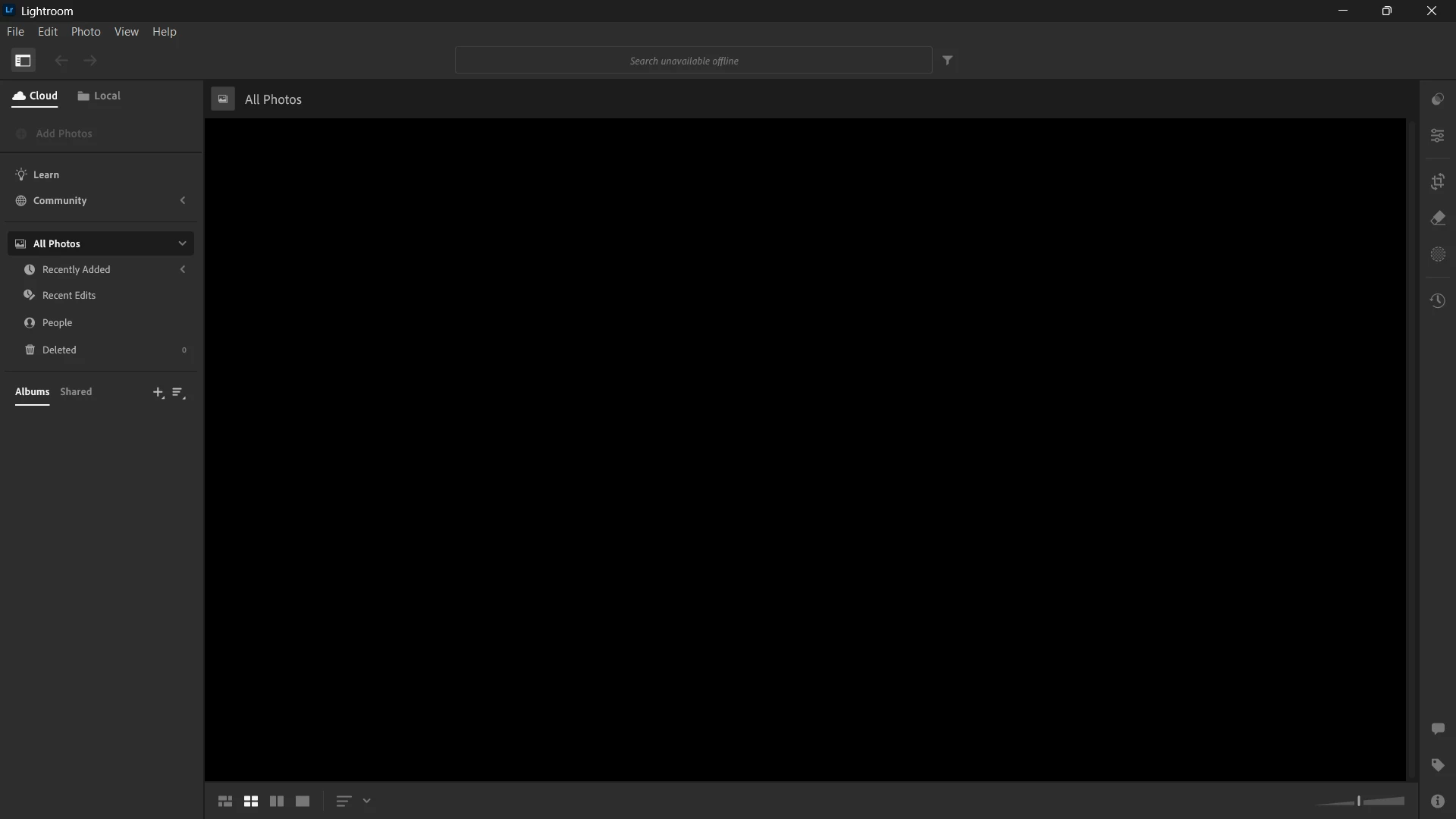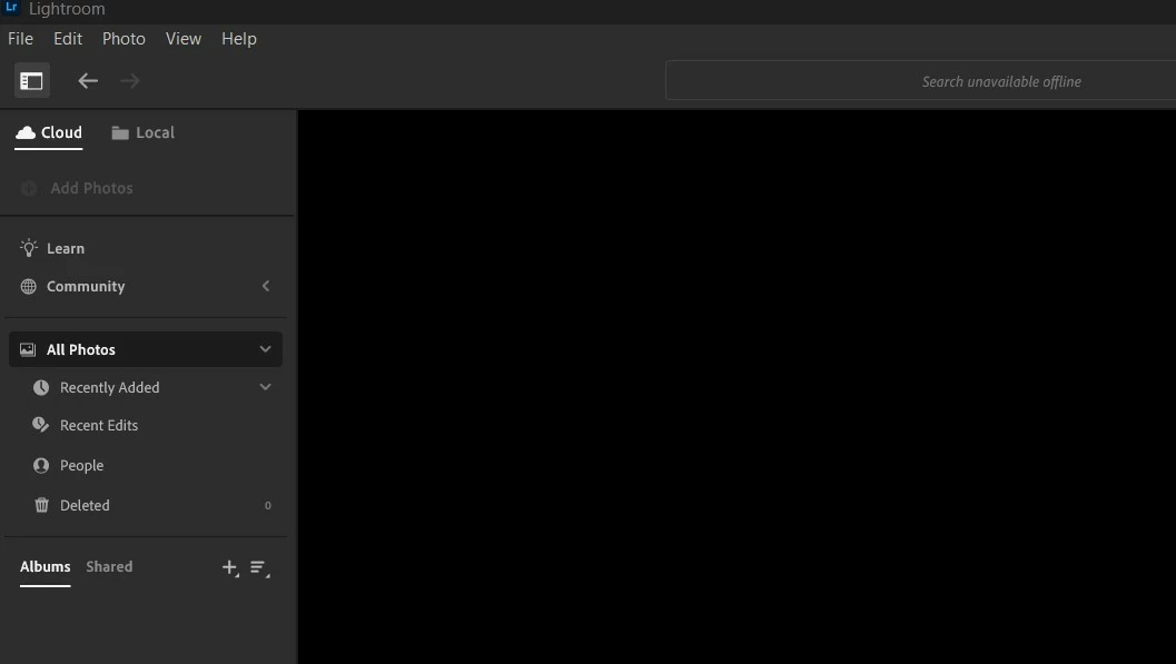Hi folks. Have been using both LR/LR Classic on my laptop for a while. Of late have been doing simple edits on my jobs using just the LR version. Yesterday I opened LR, and under the 'Cloud' tab, I see no photos in my 'All Photos' tab (there were a few thousand), nor do I see anything when I go to the top and click on the 'Local' tab. Nothing at all, no drives, no branches out of folders, absolutely zero. I have closed LR down and restarted a few times. I have also reloaded the whole Adobe Cloud Suite and opened LR once done, but still nothing. Is there a missing connection between LR and where it should be pointing to to find catalog/files etc?? Im a computer gumby so go easy pls lol !! I just need basic steps to try out and correct hopefully.