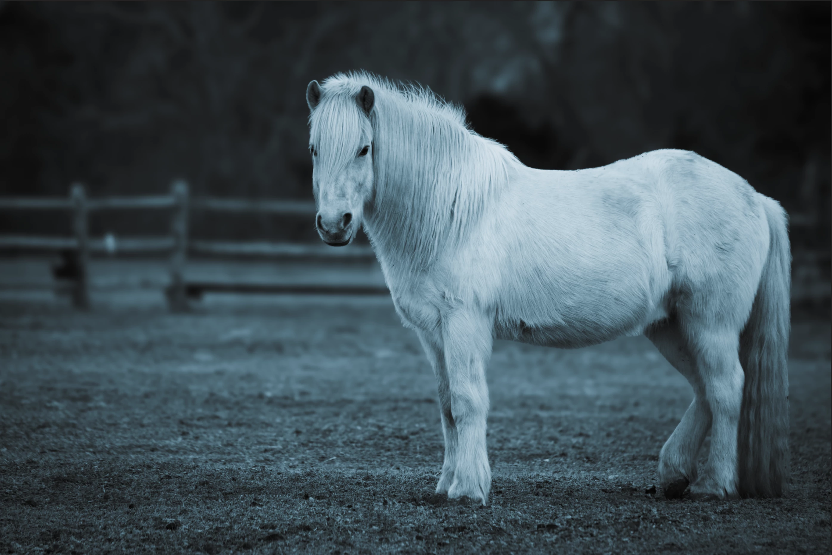 A stunning white horse stands gracefully, its mane flows gently down it's neck, catching the breeze with elegance. The deep, soulful eyes reflect a calm strength, while its poised stance exudes both power and serenity.