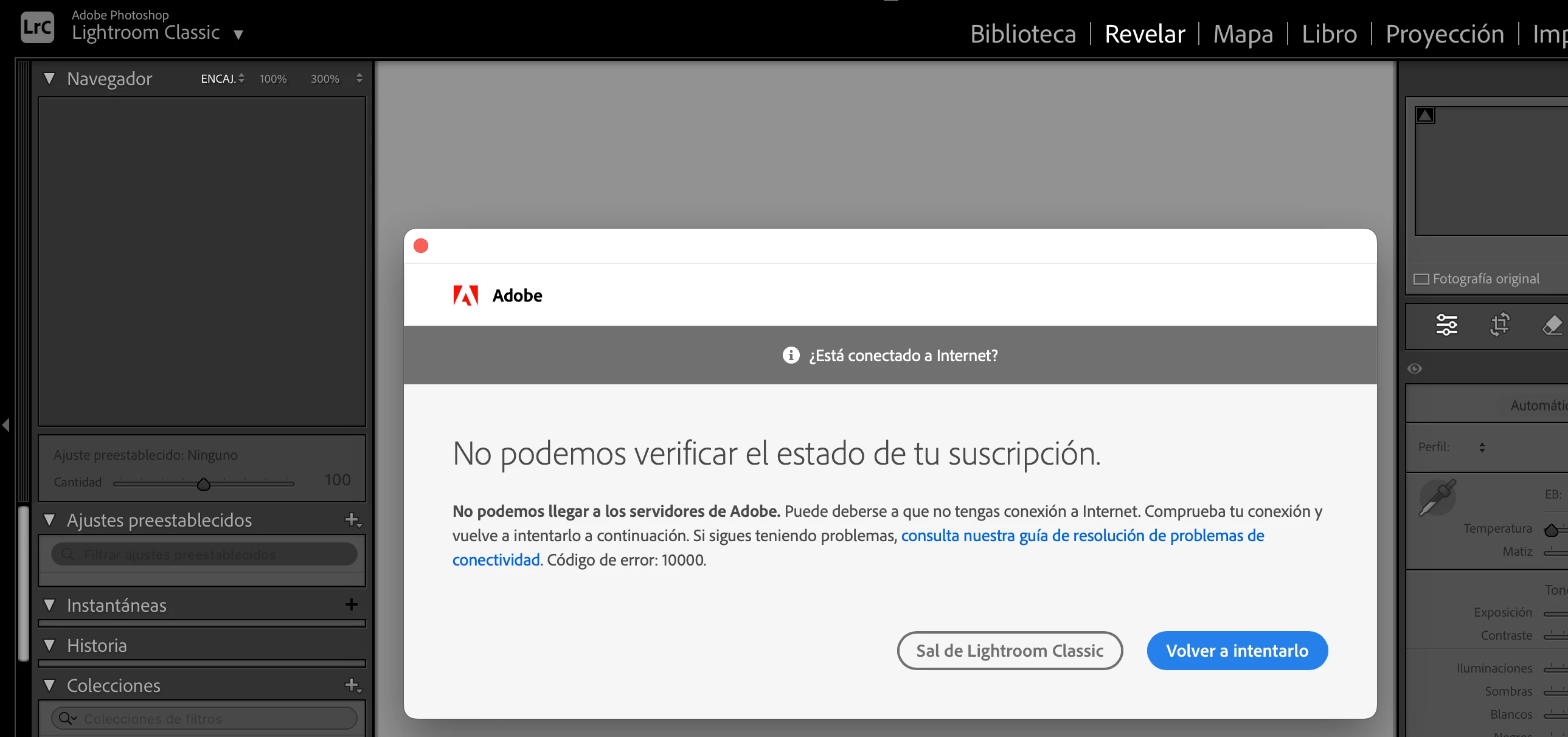 Alguien ha tenido este tipo de problemas con lightroom, porque no me deja trabajar, me sale este mensaje todo el tiempo de que no puede comprobar la suscripción.
