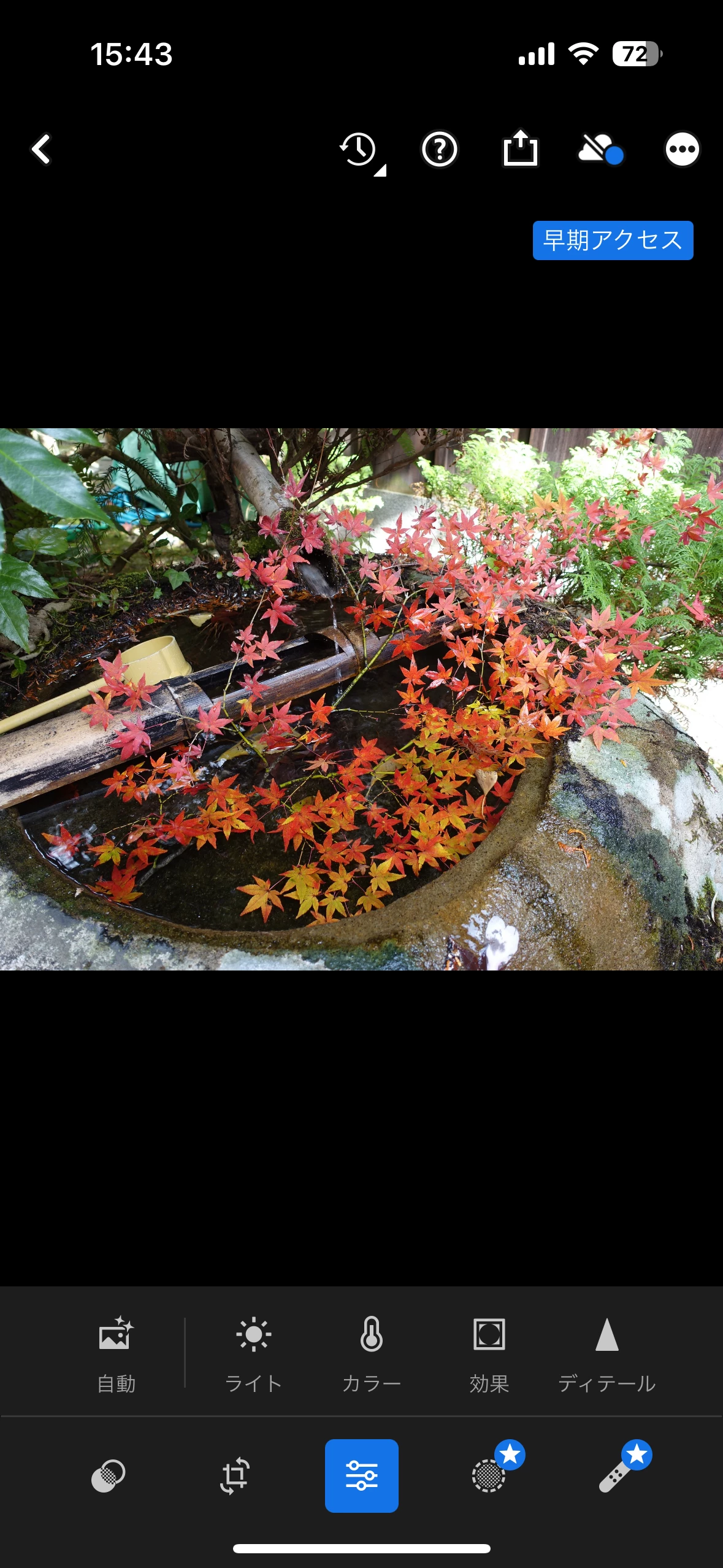 わたしが言いたかったのはこう言う事です。画面縦向きで編集する場合は編集メニューが表示されますが(写真1枚目)、横にするとメニューが表示されません。アップデート以前は横向きにしても表示されていたので、画面横向きのまま編集できました。アップデート後は横にするとメニューが表示されなくなったので、数値を変更する場合、わざわざ縦向きにして変更しないといけない。手間な上、横向き写真が多い自分にとって横向きのまま方が画面も見やすく、その常態で編集できたのに、それができなくなりました。尚、レビューの回答で教えていただいた作業は全て試みましたが改善されませんでした。横向きのまま編集する方法があるのなら教えていただきたい。