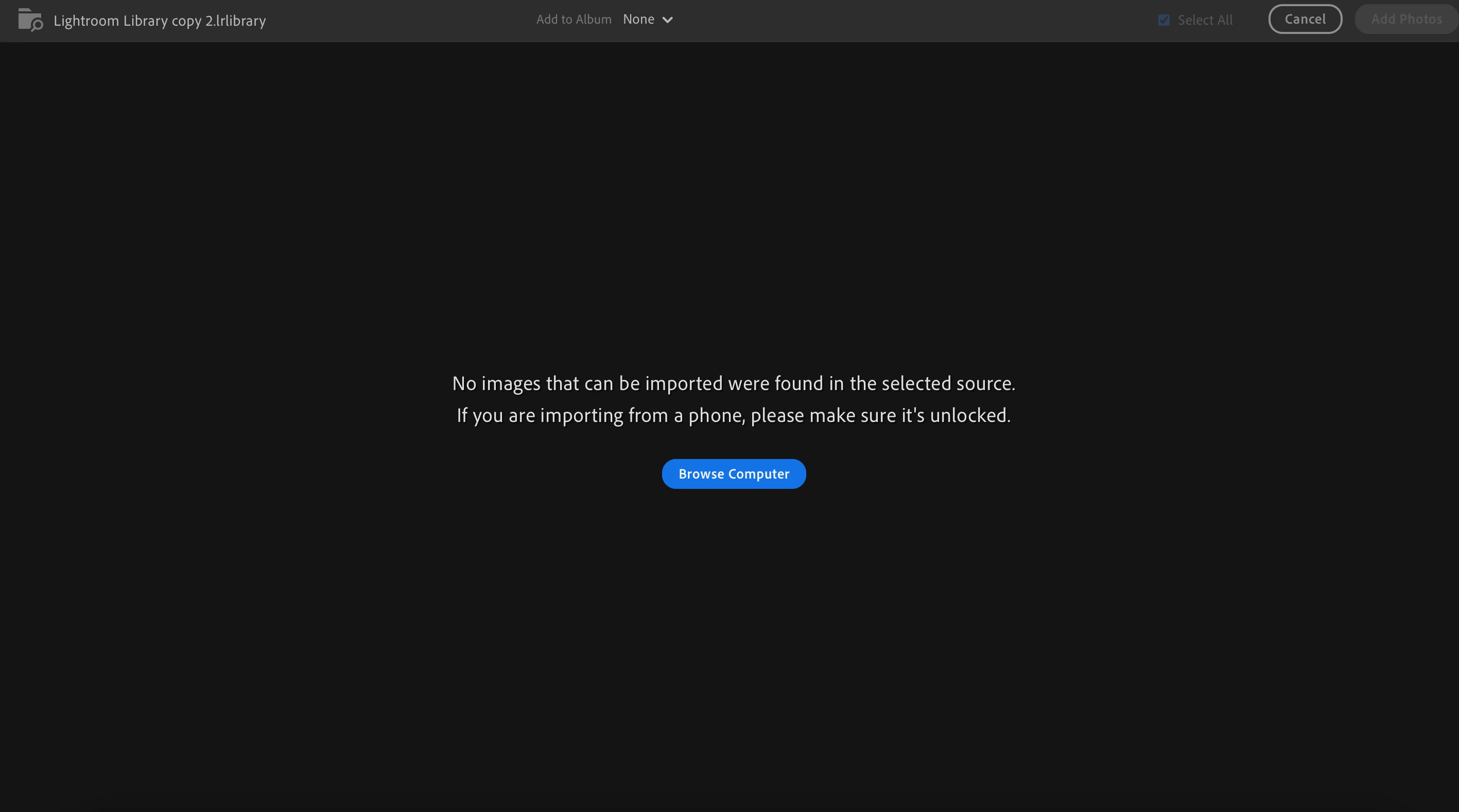 When I try to open the catalog in Lightroom, I get a message (see screenshot): "No images that can be imported were found in the selected source."