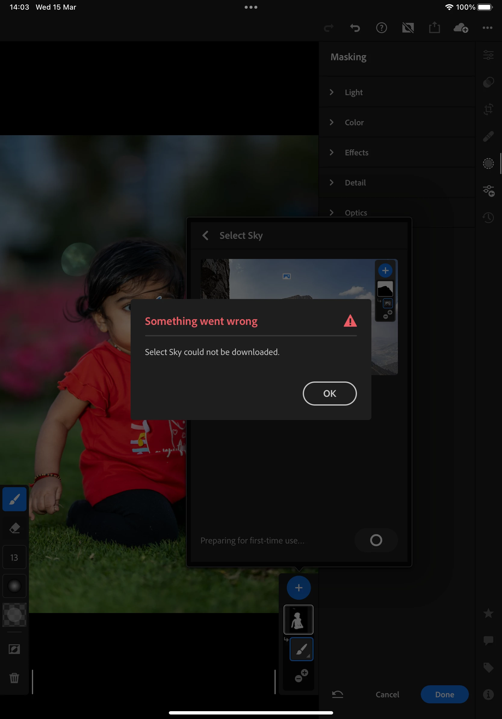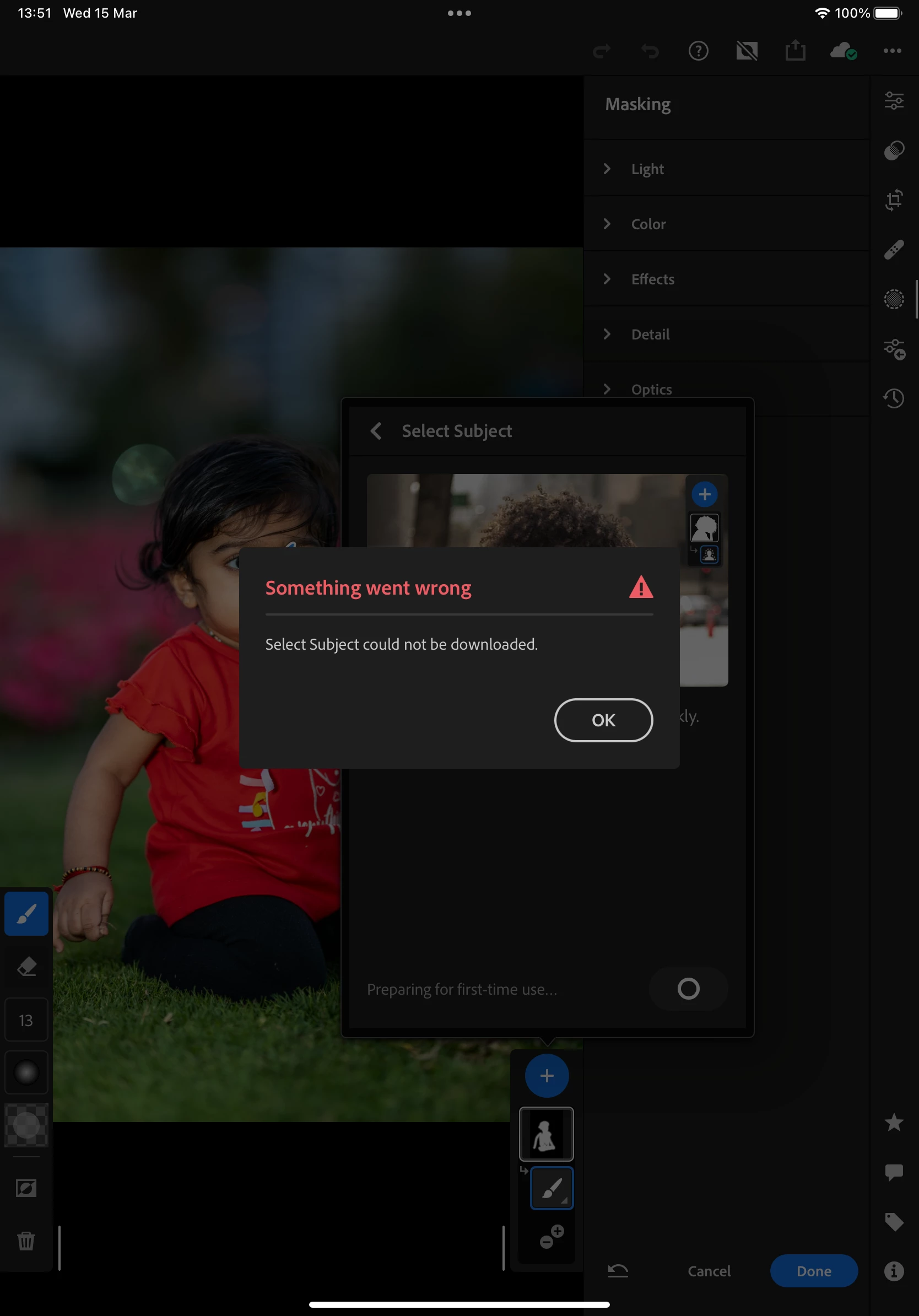 My iPad M1 pro Lightroom app select subject ,select sky option not downloading "something went wrong " warning coming and adaptive:portraits AI related preset not working
