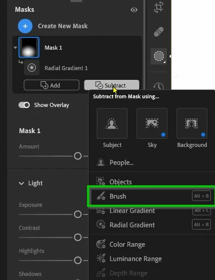 Just getting started on my photo edit. I create a radial (instead of linear... those are my only two options?) and now I need the brush tool to eliminate part of the mask. Where do I find the brush tool?