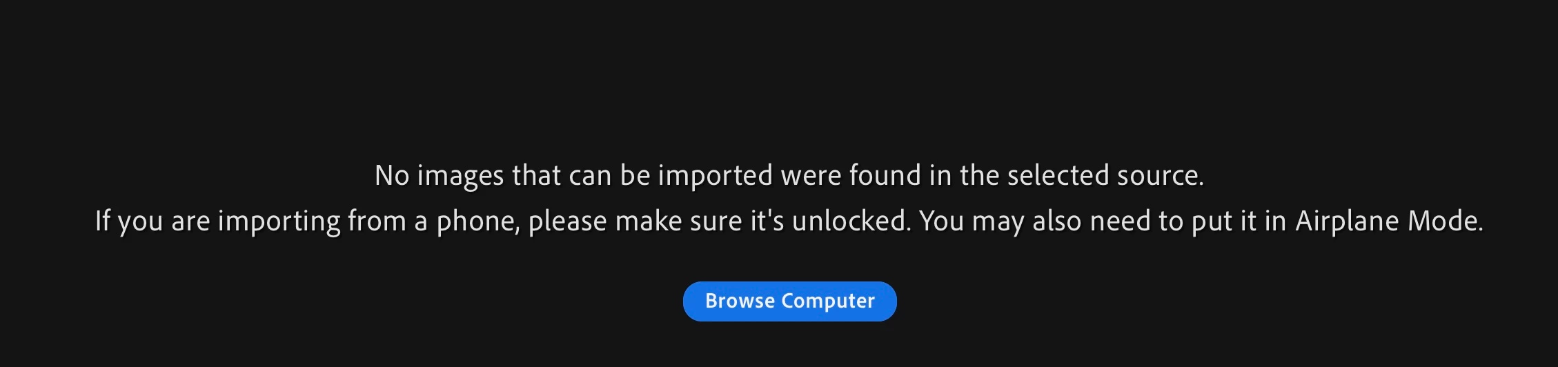 For quite a while I've had an issue where no photos are found when I click the Add Photos button. The message reads "No images that can be imported where found in the selected source"