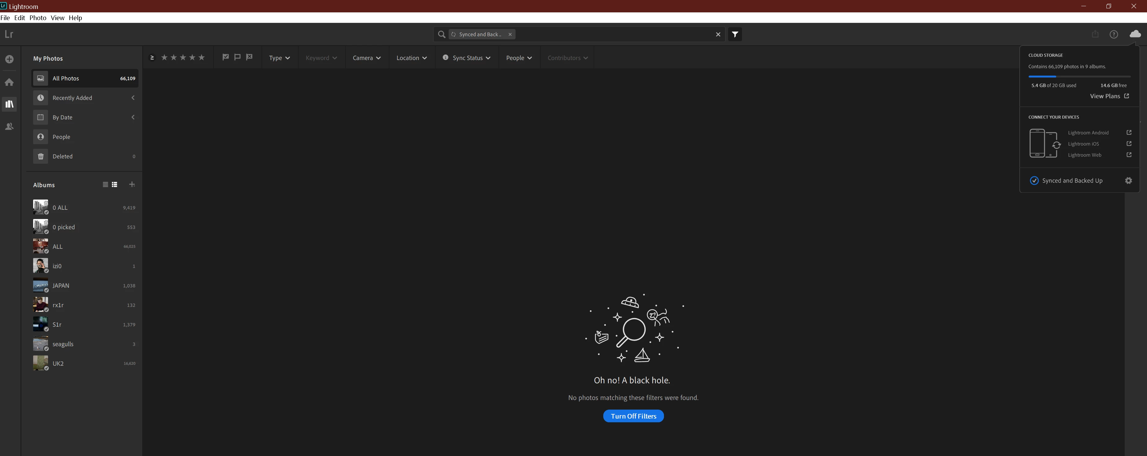 Izi0, I think this thread is slightly hampered by terminology. "LR CC" or "Lightroom CC" usually refers to what is now just called "Lightroom" which is what your screenshot is from. From your replies I think you are confirming that you did upload your 60,000 Smart Previews from Classic (not LR CC) which solves part of the mystery, but still puzzling that you have 5.4GB of your 20GB used, and zero syncd and backed up.