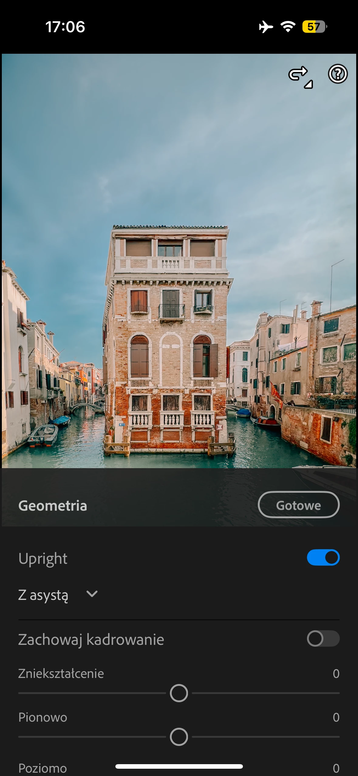 In Lightroom Mobile version 10.1.1 on iOS (iPhone), the term "Upright" in the Geometry section is not translated into Polish.