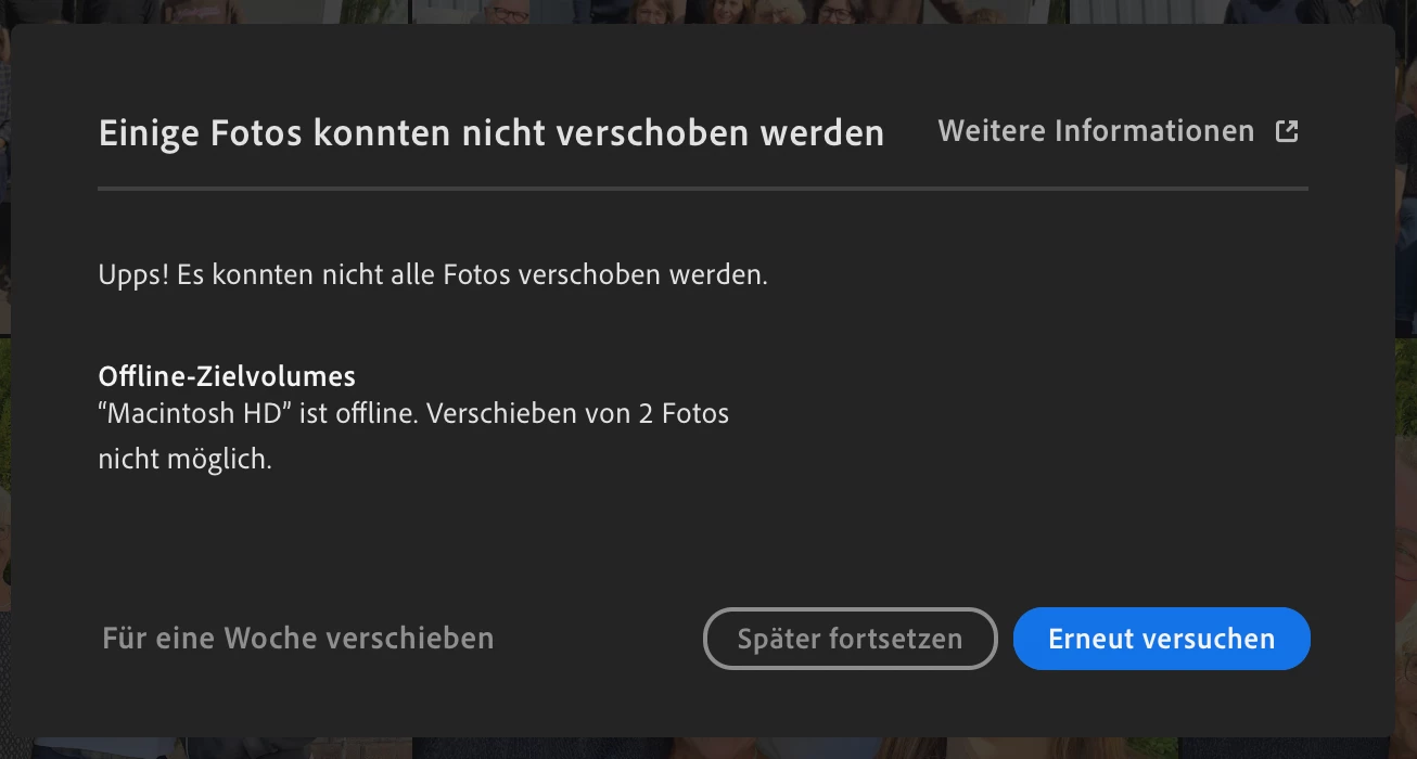 Ich habe seit dem letzten Update das Problem, dass beim öffnen von Lightroom die Meldung kommt, das Zielvolume sei offline und ein verschieben der Bilder sei nicht möglich? Ich habe schon Festplattenvollzugriff genehmigt für Lightroom un Photoshop. Es hat sich dadurch aber nichts geändert. Was bedeutet diese Meldung bzw. was kann ich tun um das zu fixen? Danke für Unterstützung!