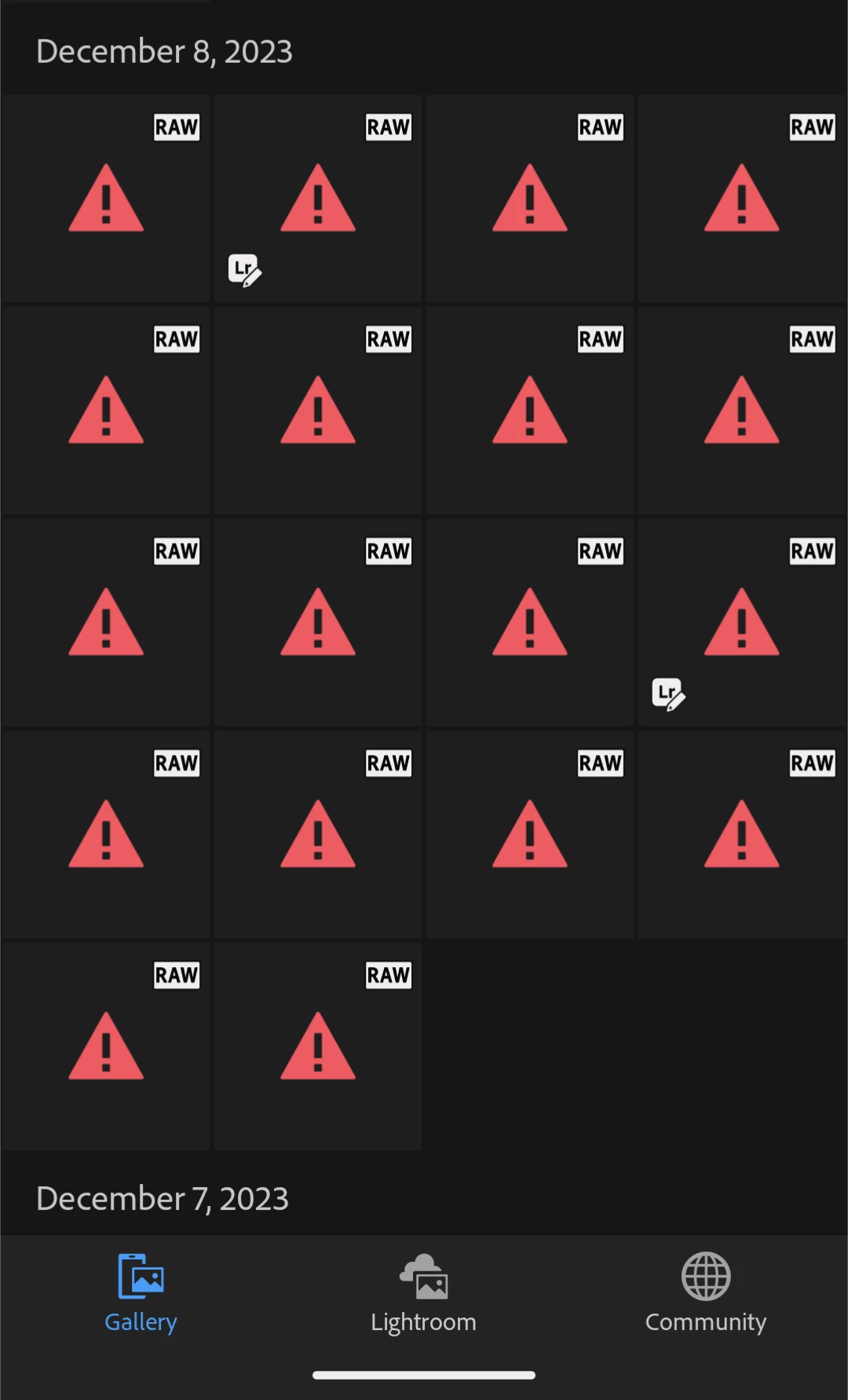 SSamqwerty123ParticipantForum|Forum|2 years agoMarch 18, 2024QuestionOM-1 Raw files Exclamation Mark ThumbnailForum|Forum|2 years agoMarch 18, 20240 replies117 viewsWhen I open LR, the thumbnail raw files that are on my device display an exclamation mark. There is no issue when I click to view the file but it is a hassle to go through one by one. This happened only after the recent update.Android