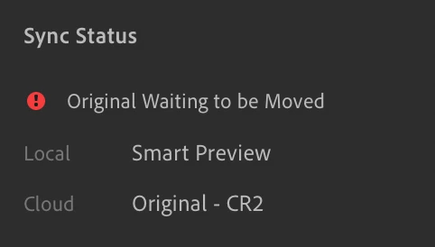 When it finished I thought everything was dandy, but I am realizing now that all I have are the smart previews and when I click the cloud dropdown window says it is 'all synced and backed up'... When I click the info tab, it says "Sync Status: Orginal Waiting to be Moved". This is the case with all my photos... not sure what the deal is. Thanks in advance