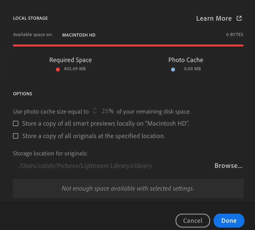 my storage is going crazy? I have 2 GB of avalible space and some how my lightroom is taking up most of my storage because of the libray. How do I fix this? I dont understnd and I feel like Im going crazy because I cant edit ANYTHING or uploade ANYTHING. Please Im begging anyone to help me at this point