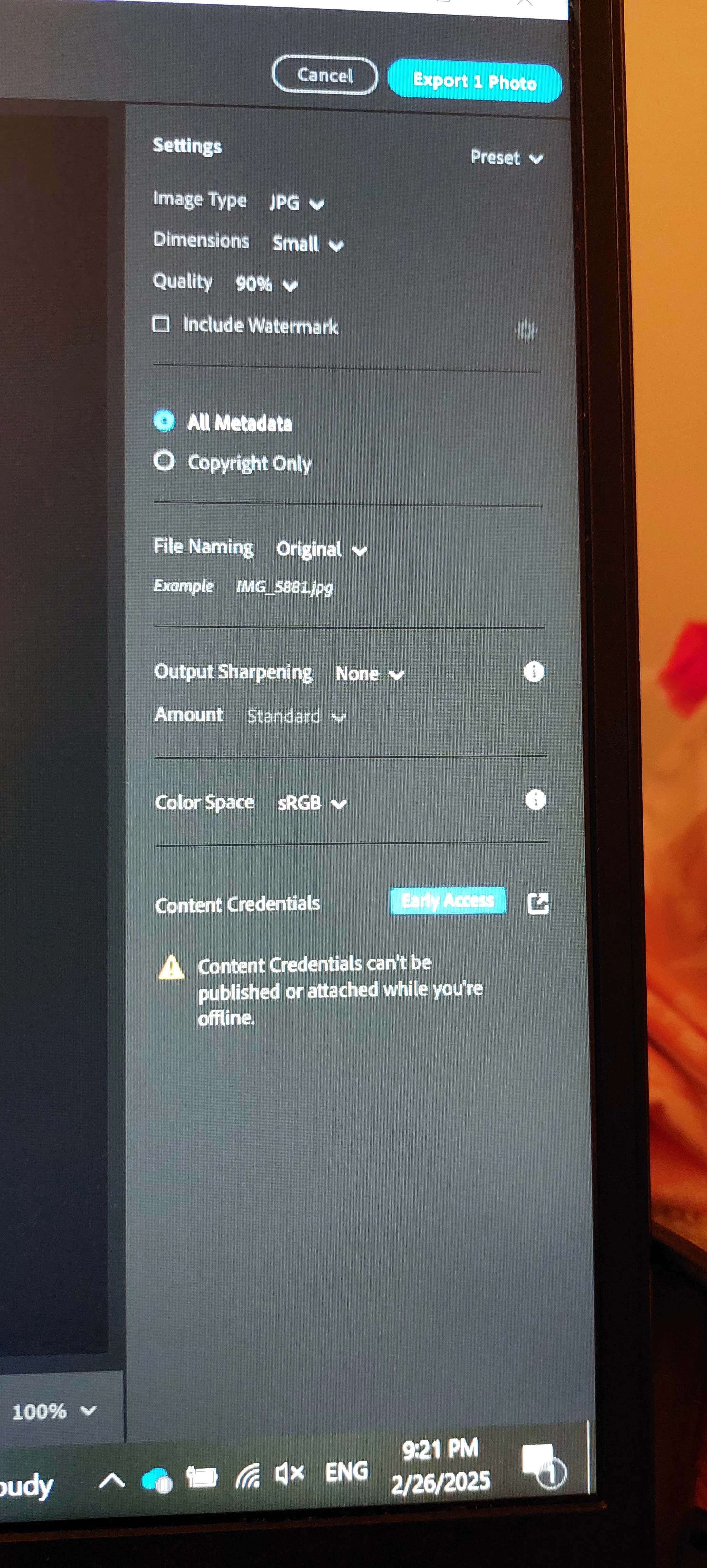 You can find the option to apply Content Credentials while exporting a JPEG in the export panel. It is, by default, turned OFF. You can choose to enable this option at the time of each export or enable it in App preferences for every export. Learn more.