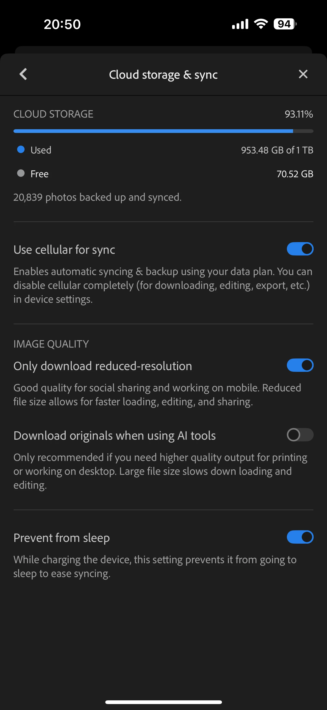 In the meantime, please go to Lightroom settings > Cloud Storage & Sync > enable Use cellular for Sync.
