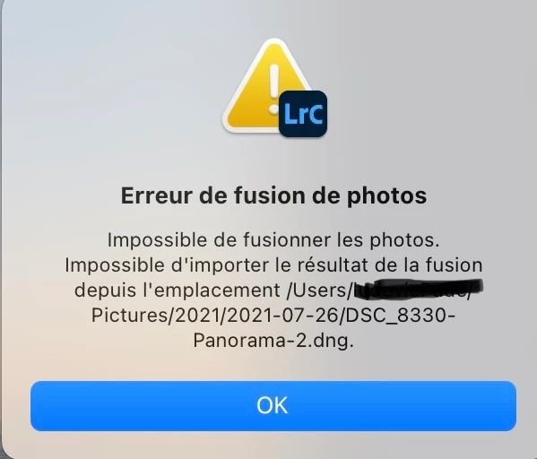 bonjour je viens de prendre possession de mon MacBook Pro M1 Pro, après une clean install et avoir réinstallé ma bibliothèque Lightroom, je rencontre un problème lors des fusions de photo (panorama et hdr), avec le message que vous pouvez voir sur cette capture d écran. Est ce que ce problème est connu, une solution existe t elle?