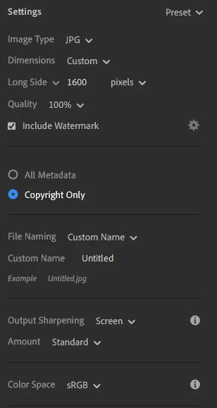 - Used the export menu with custom settings: JPG, custom dimensions (1600px long side), quality 100%, include watermark, output sharpening set to standard, and colour space set to sRGB.