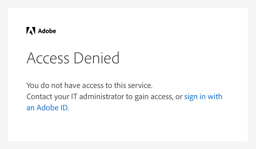 Upon trying to open the Lightroom desktop app (for Mac), I am getting the "access denied" error message (attached). Signing in with my Adobe CC ID (which I use on my phone for mobile apps) does not help.