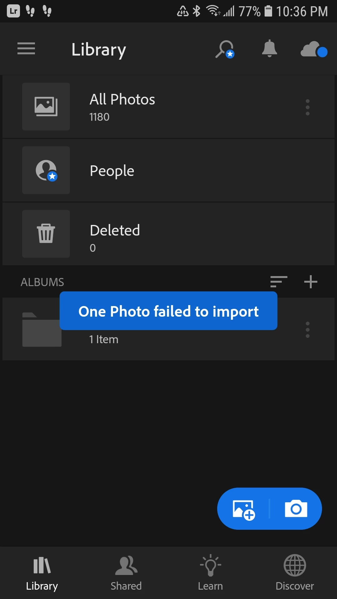 ekaterinan76977205ParticipantForum|Forum|3 years agoJune 26, 2022QuestionPhotos failed to importForum|Forum|3 years agoJune 26, 20220 replies207 viewsHello, I am unable to import any photos from my phone to my Lr. It worked fine before but now it just stopped importing any photos. Any tips would be greatly appreciated! My version is Lightroom Android v7.4.1Thanks!! Android