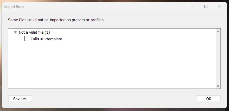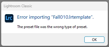 I am trying to import some presets to Lr CC but it keeps giving me this message. I have tried the classic as well and get the same message.