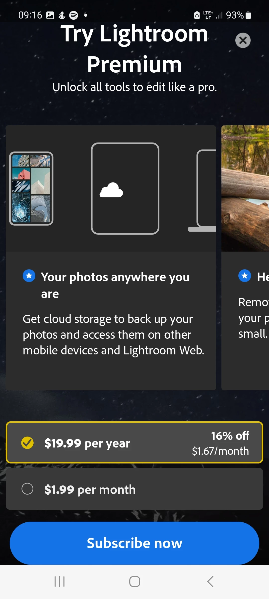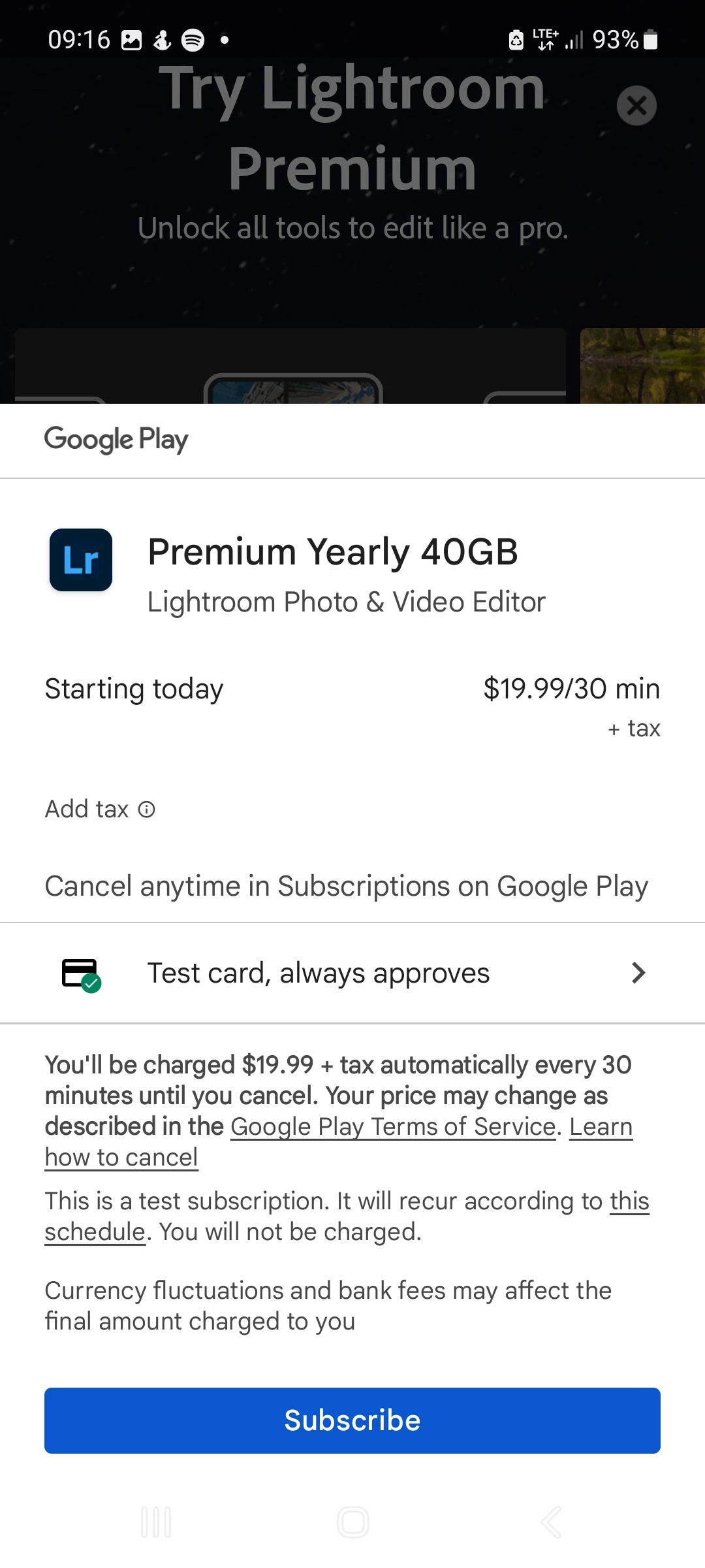 I was trying to upgrade to Lightroom Premium for Android via the app, and it tried to charge me $19.99 per EVERY 30 MINUTES!!!! No joke. You really need to fix this ASAP.