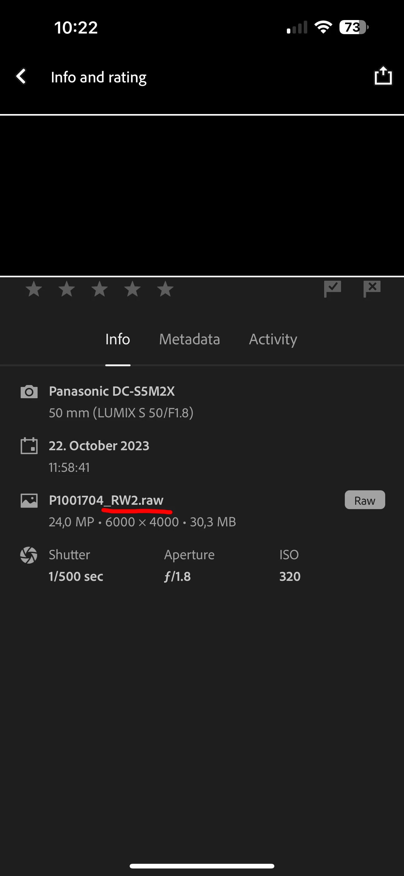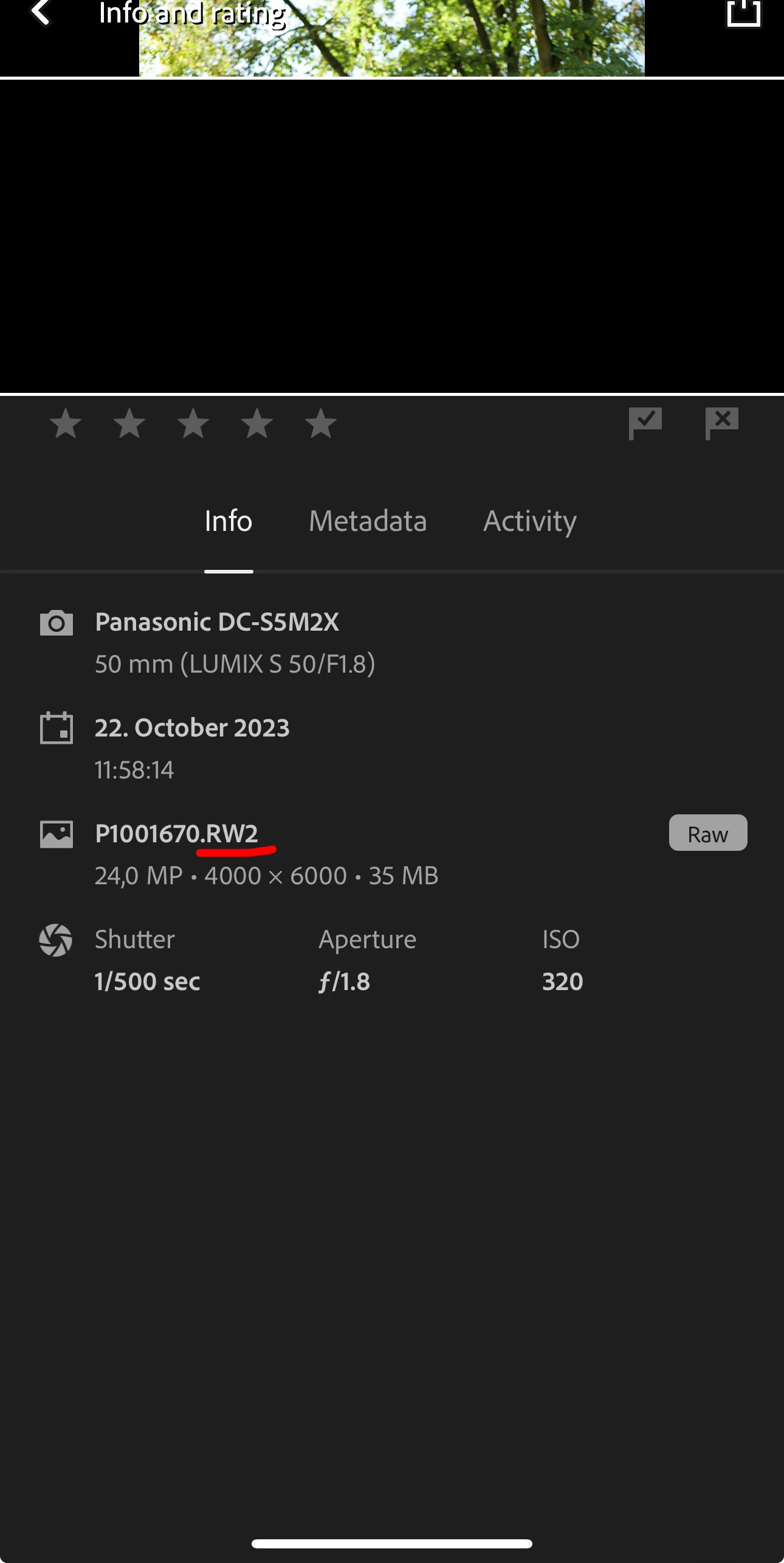 There is a technical problem in Lightroom Mobile when importing RAW photos from my camera (Panasonic S5 II, RW2 format). When importing from iPhone (both through "Files" and "Photos") files in Lightroom change the extension from "RW2" to "RAW", with "RW2" still part of the name. Such photos are displayed on the import device (iPhone) in full resolution, but after synchronization with the cloud, other devices often display only Smart Preview (although full synchronization is enabled in the settings). The first screenshot shows a photo imported from a PC or Android device. The photo has the correct extension "RW2", on the second screenshot the photo from the same camera with the same parameters imported from iPhone has the extension "RAW".