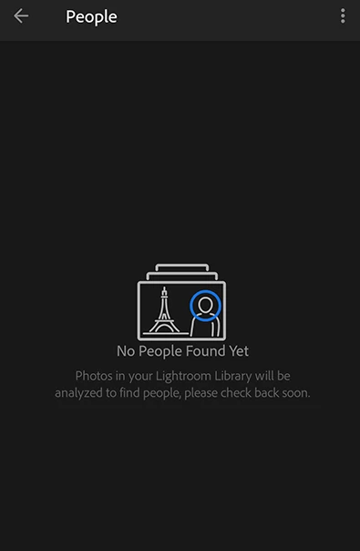 - If you see a message that says "No People Found Yet", then either Lightroom is still analyzing all your photos to find people or there are no people in your photos.