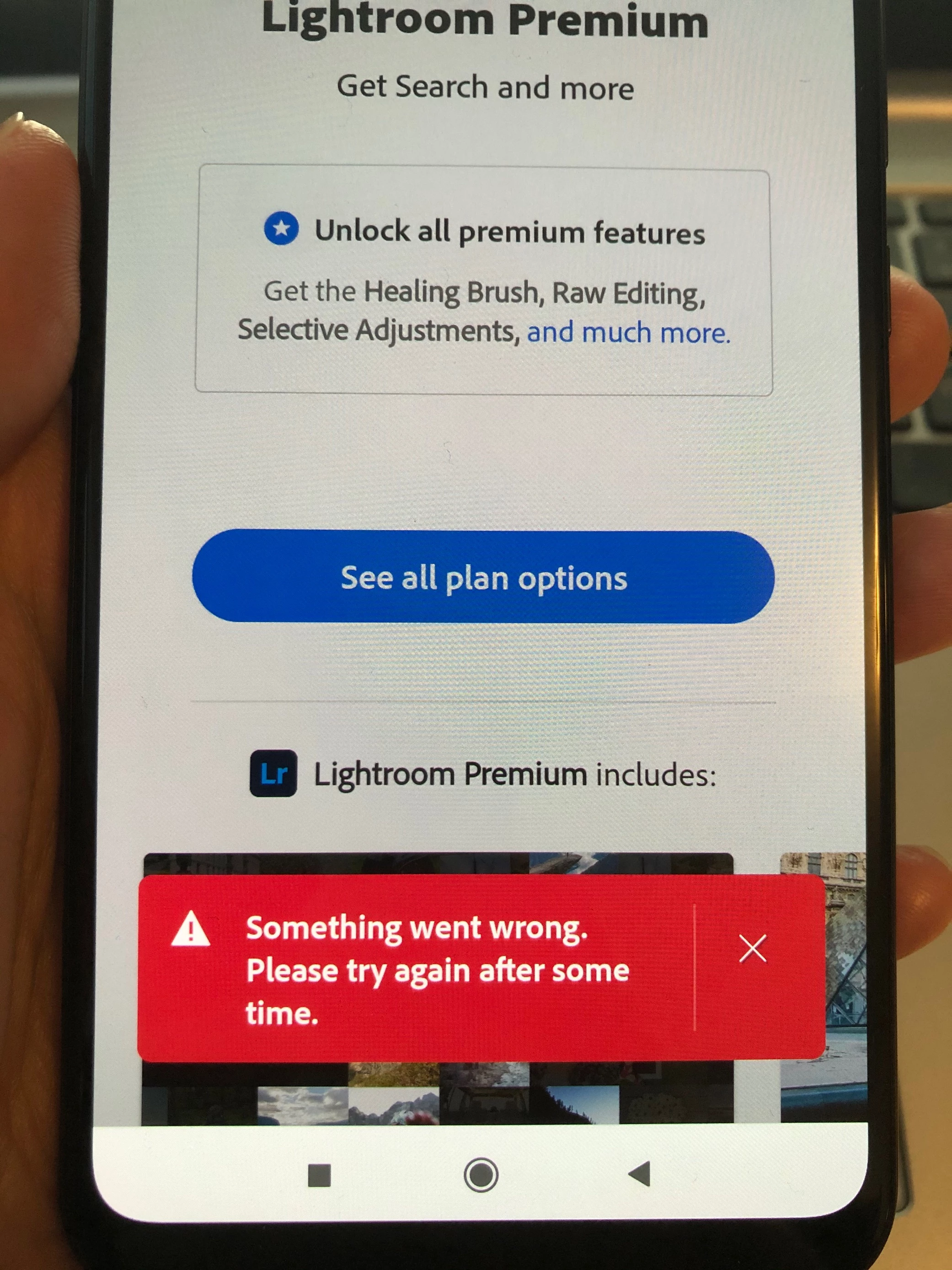 Hi I am also not able to use premium on Lightroom mobile I am getting the error "something went wrong". My Adobe ID is cello925