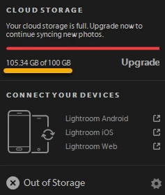 I thought that Lightroom CC as part of the full CC plan came with 10TB of storage, so I started uploading all files from Lightroom Classic. At 100GB (which is a far cry from what I expected), the upload stopped.