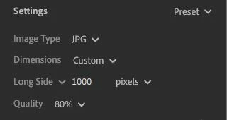 How do I change an image size and or dimensions before exporting? My images have to be a maximum of 1100 pixels wide. The file size must not exceed 1.5MB (megabytes) or be smaller than 15kb (kilobyte).