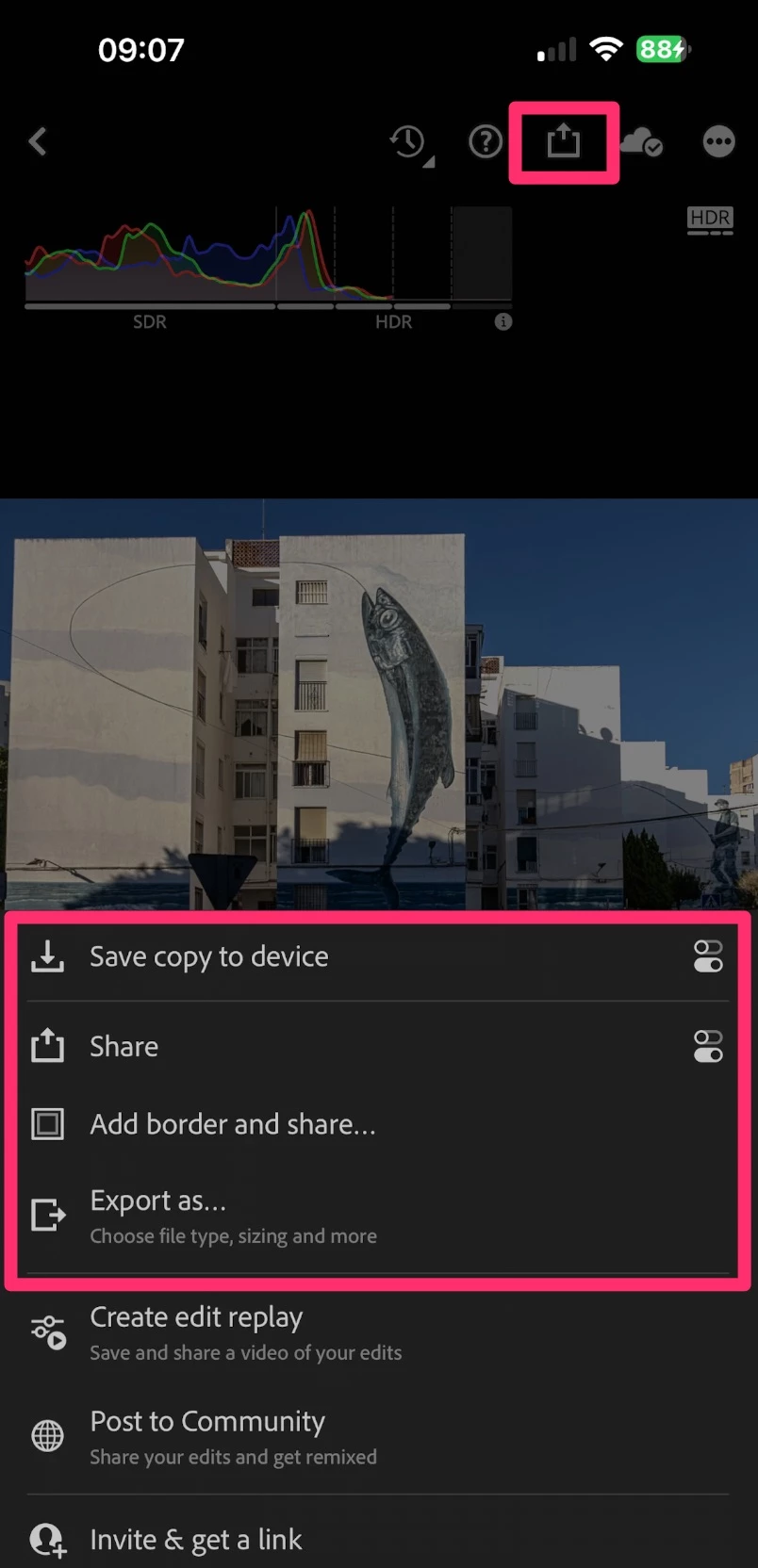 There are a lot of save/export options already available in the Lightroom app. Select an image, tap on the share icon on the top toolbar and you'll then see all the various options, most of which you can customise: