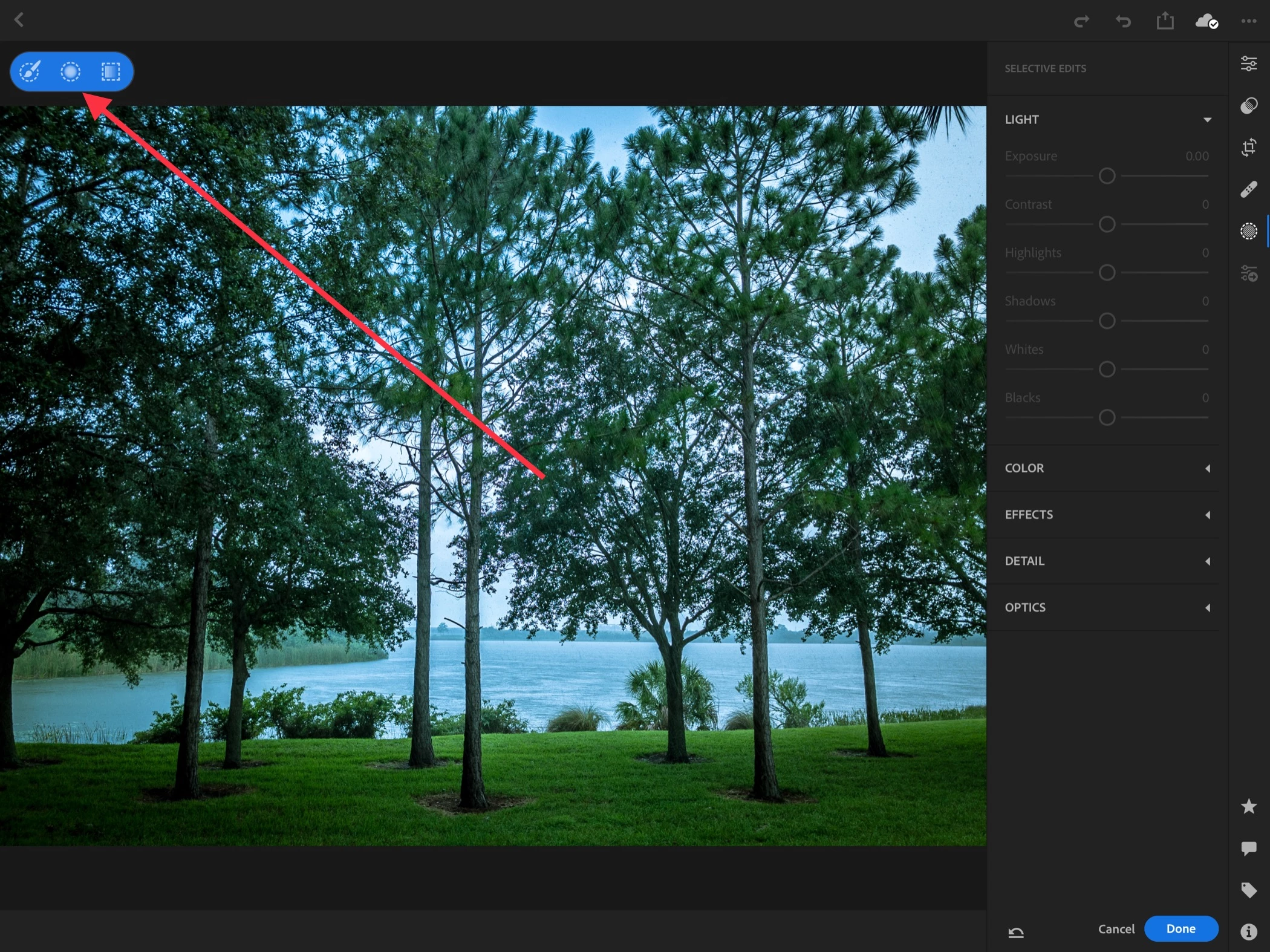 Step 2: Choose the type of local adjustment (Linear, Radial, Brush). Here I’ll choose Radial.